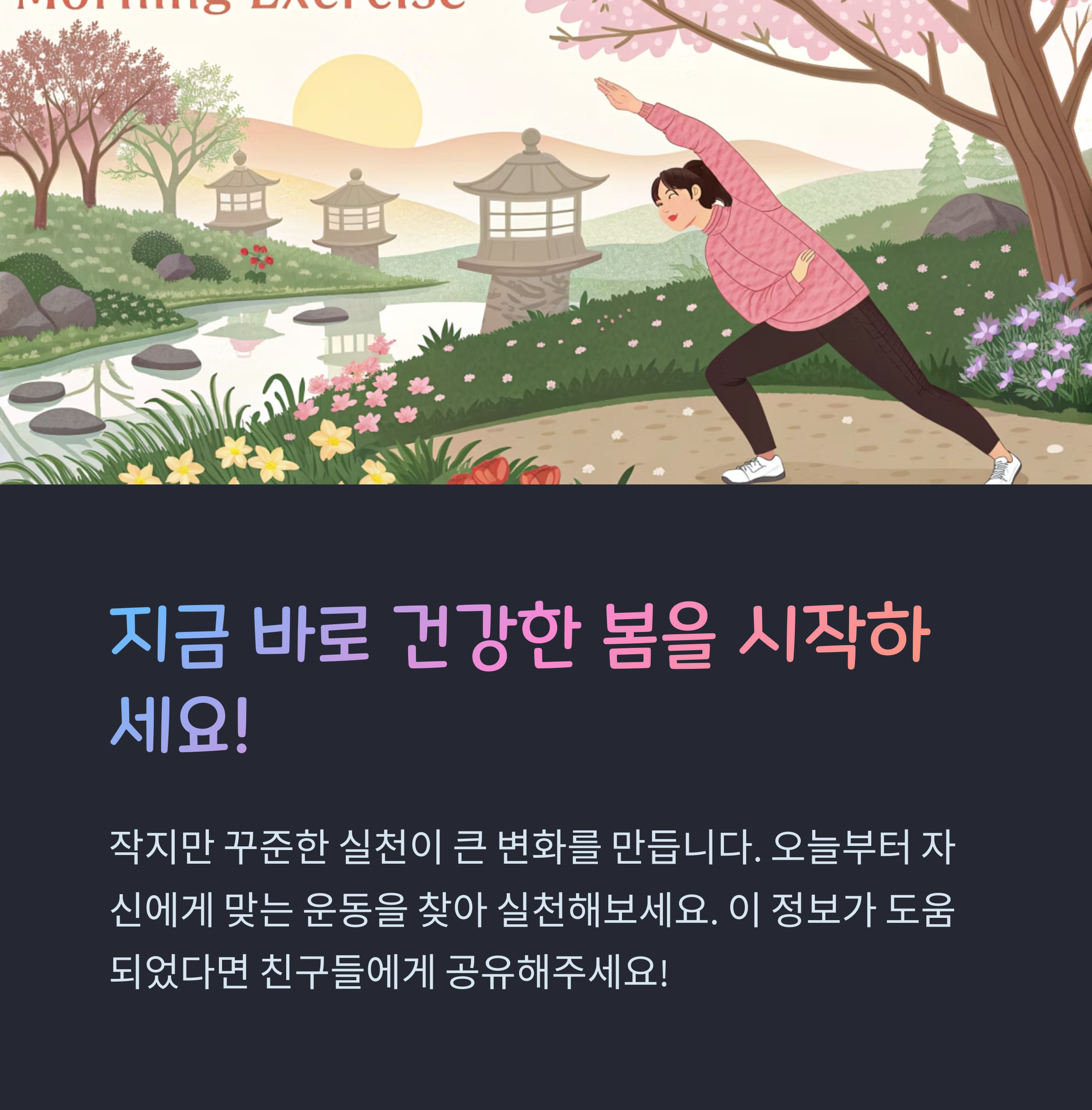 여러분은 어떤 봄철 운동을 계획하고 계신가요? 댓글로 여러분만의 운동 계획이나 팁을 공유해주세요. 함께 건강한 봄을 맞이해봐요! 🌸
