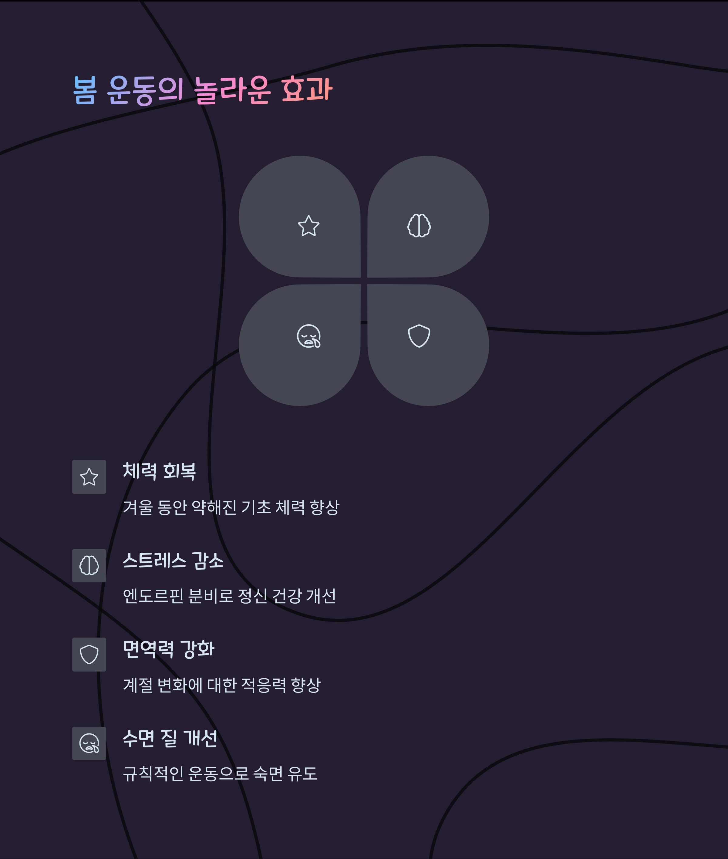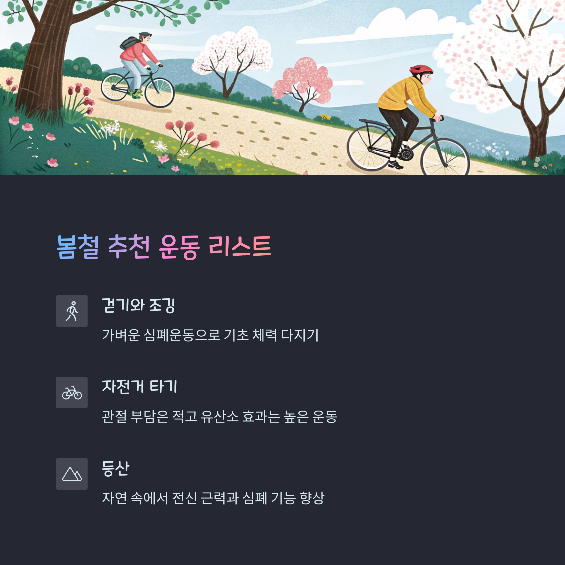 이번 봄에는 무리하지 않고 꾸준히 할 수 있는 나만의 운동 루틴을 만들어보세요. 건강한 몸과 마음으로 활기찬 봄을 맞이할 수 있을 거예요!