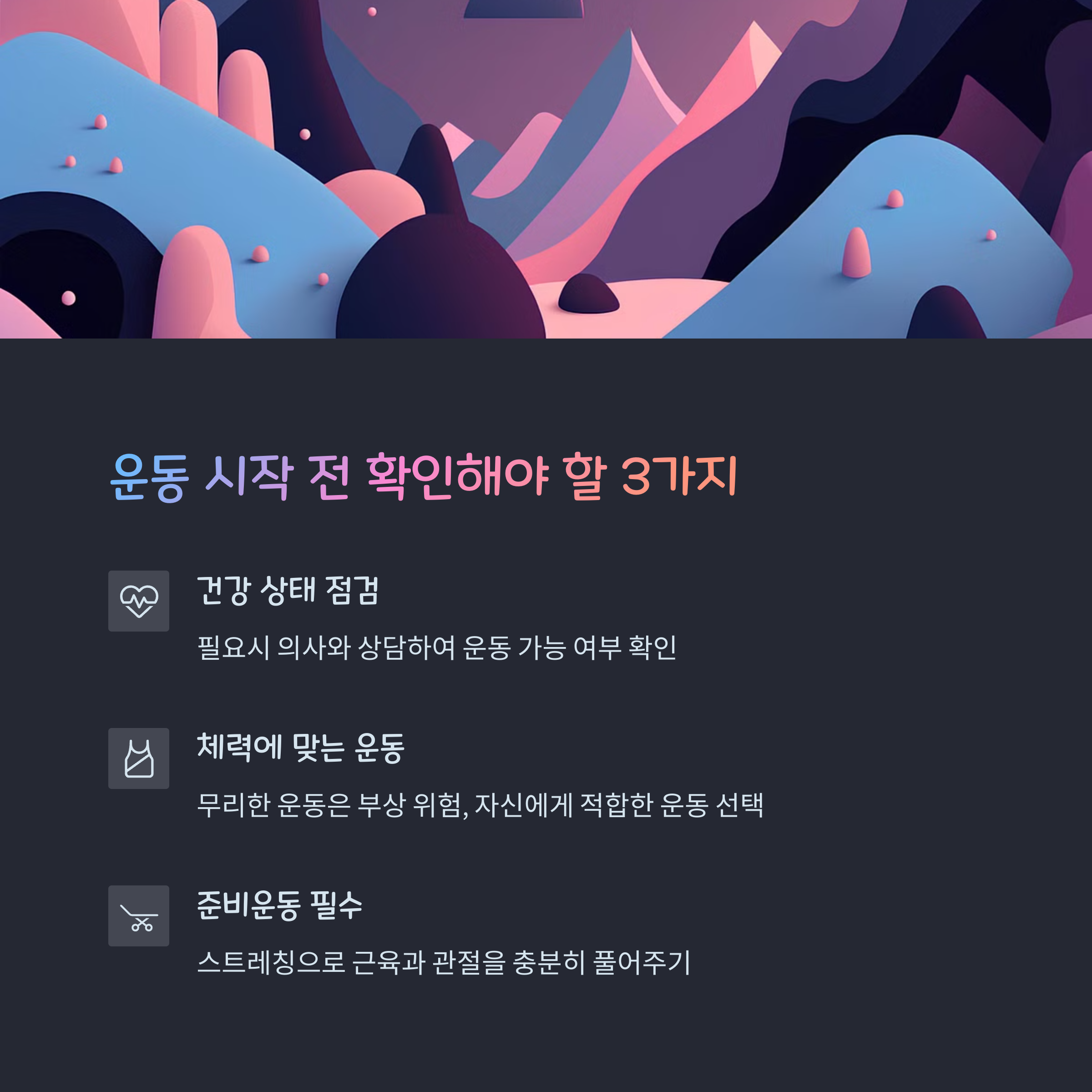 - 적절한 운동 선택하기: 자신의 체력과 건강 상태에 맞는 운동을 선택하세요. 처음부터 무리하지 마세요.