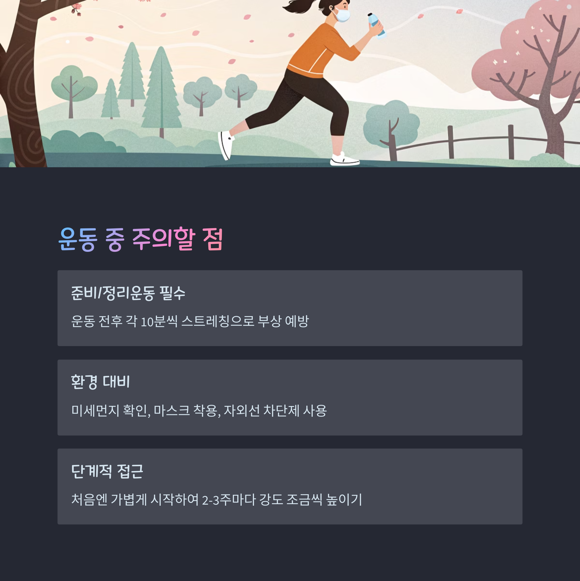 - 미세먼지·황사: 실외 운동 전 공기질 확인!