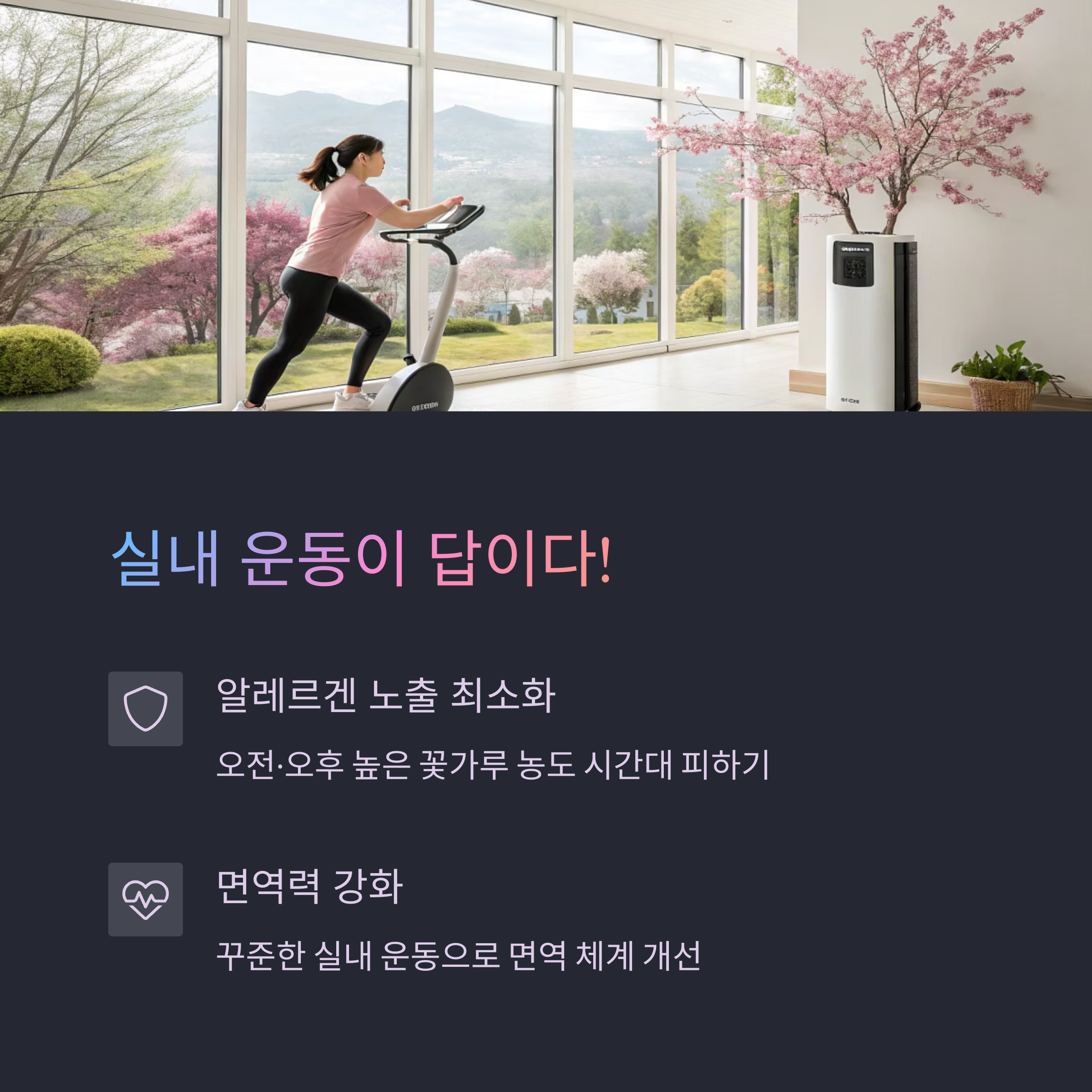 📌 알레르기 운동 팁: 꽃가루가 많이 날리는 오전 시간대나 바람이 강한 날에는 야외 운동을 피하고 실내 운동을 선택하세요. 실내 운동은 알레르기 유발 물질에 대한 노출을 최소화하면서 운동 효과를 얻을 수 있습니다.
