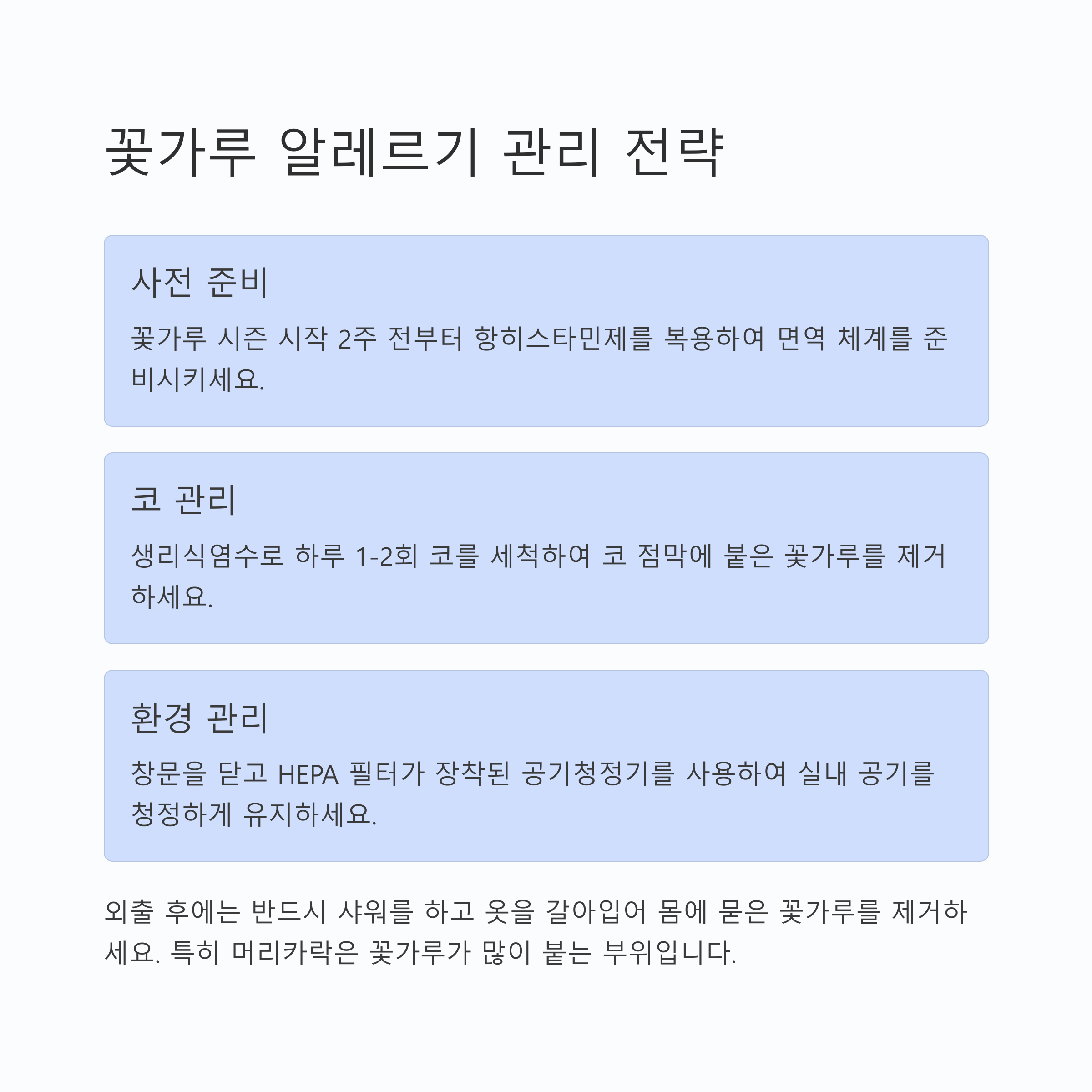 - 귀가 후 즉시 샤워하기: 옷과 피부에 붙은 꽃가루 제거