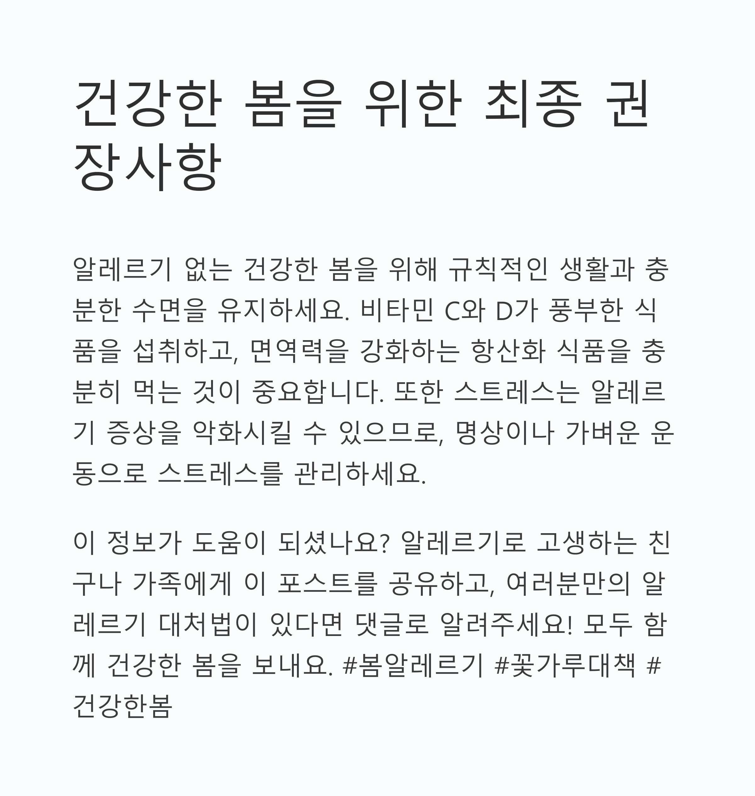 봄철 알레르기는 분명 불편하지만, 적절한 관리와 예방법을 통해 증상을 크게 줄일 수 있습니다. 꽃가루 지수를 모니터링하고, 외출 후 즉시 샤워하며, 실내 환경을 깨끗하게 유지하는 등의 간단한 습관으로도 큰 변화를 만들 수 있습니다.