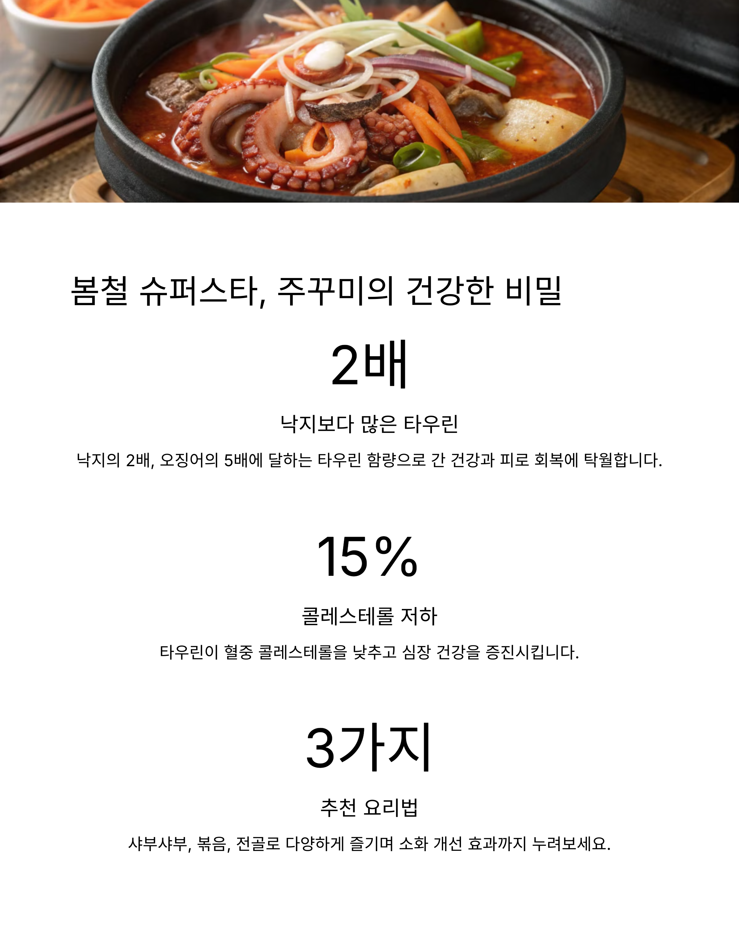 타우린이 풍부하여 피로 회복과 간 건강에 도움을 줍니다. 특히 3~5월 주꾸미는 알이 꽉 차 있어 쫄깃하고 감칠맛이 뛰어나죠.