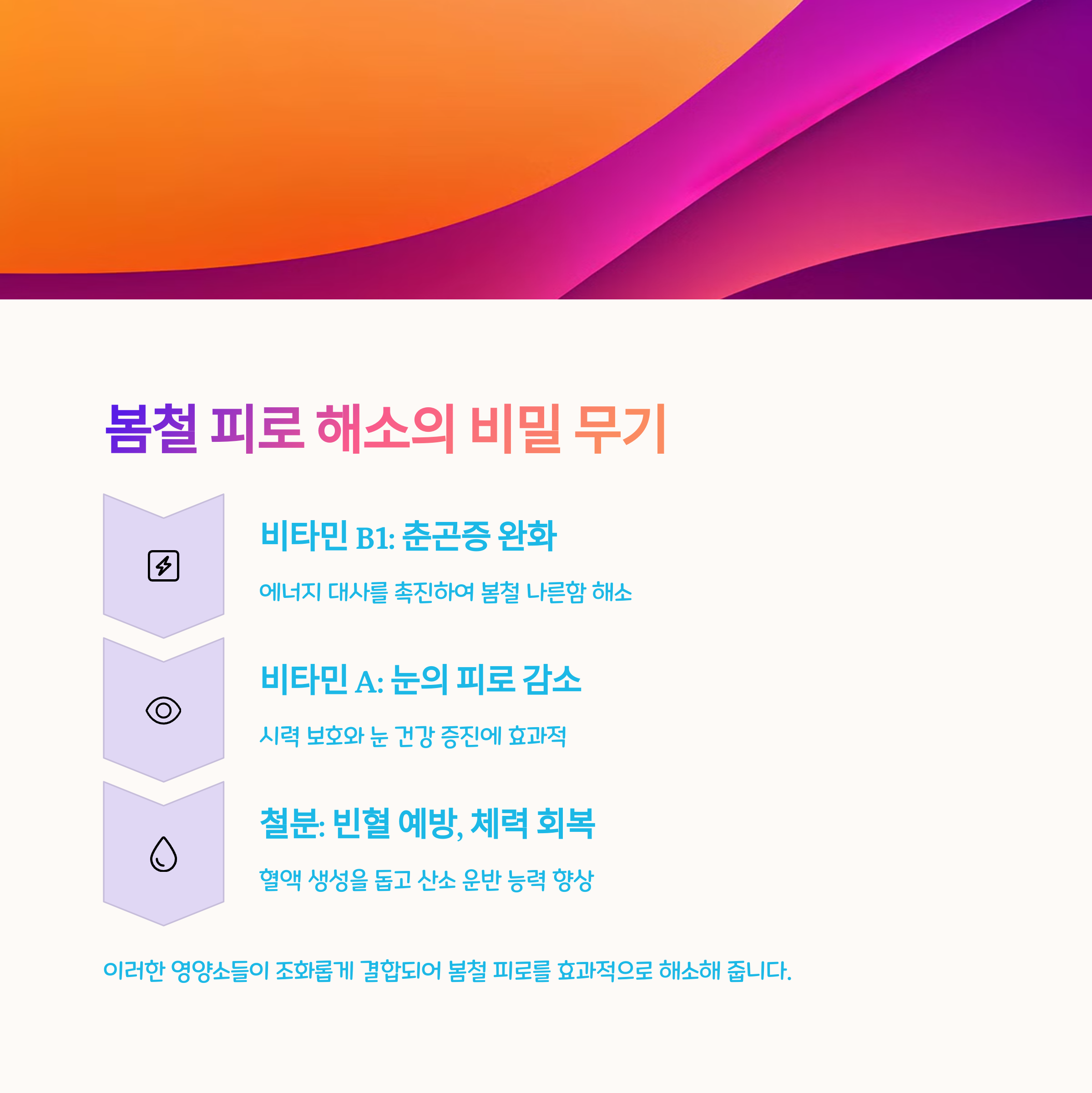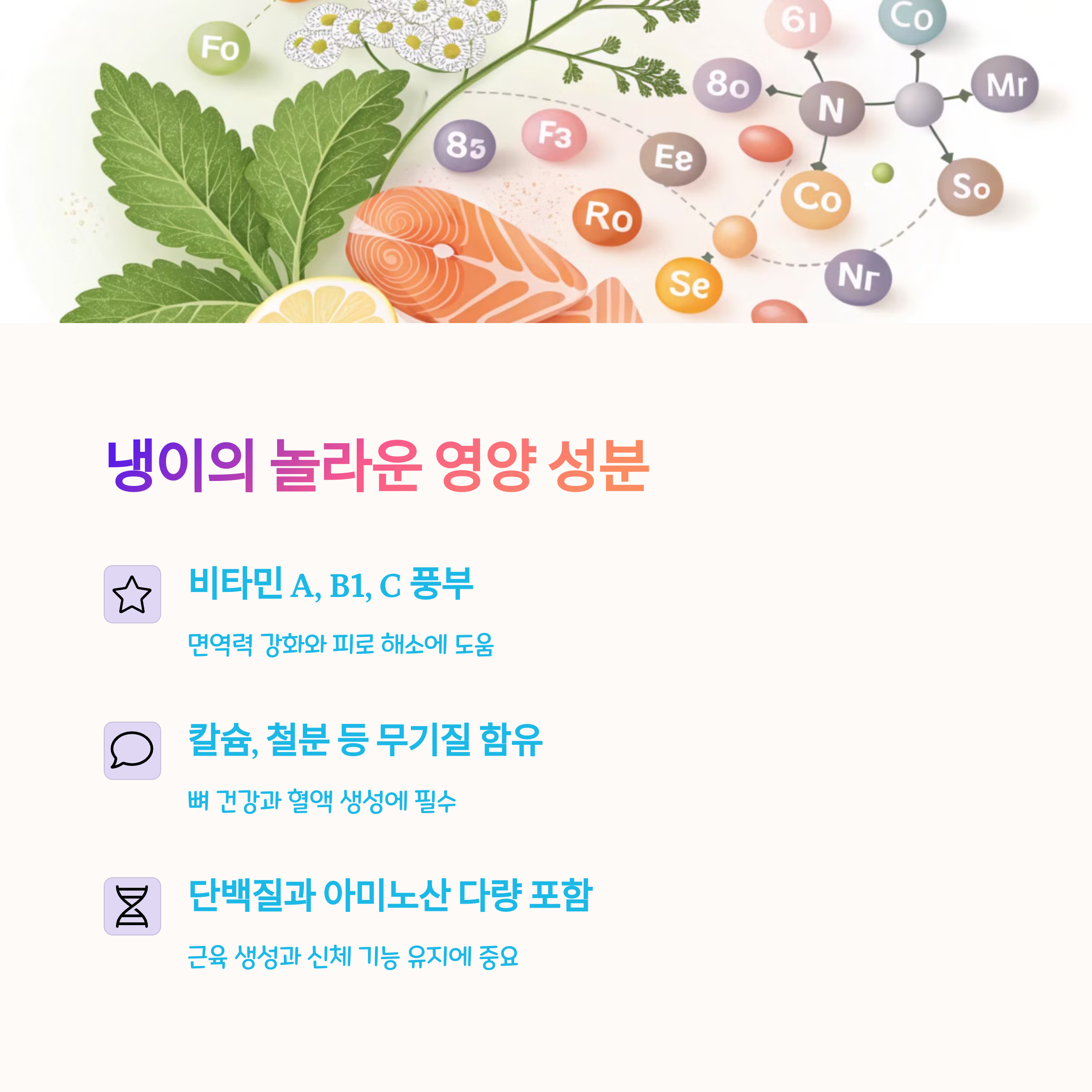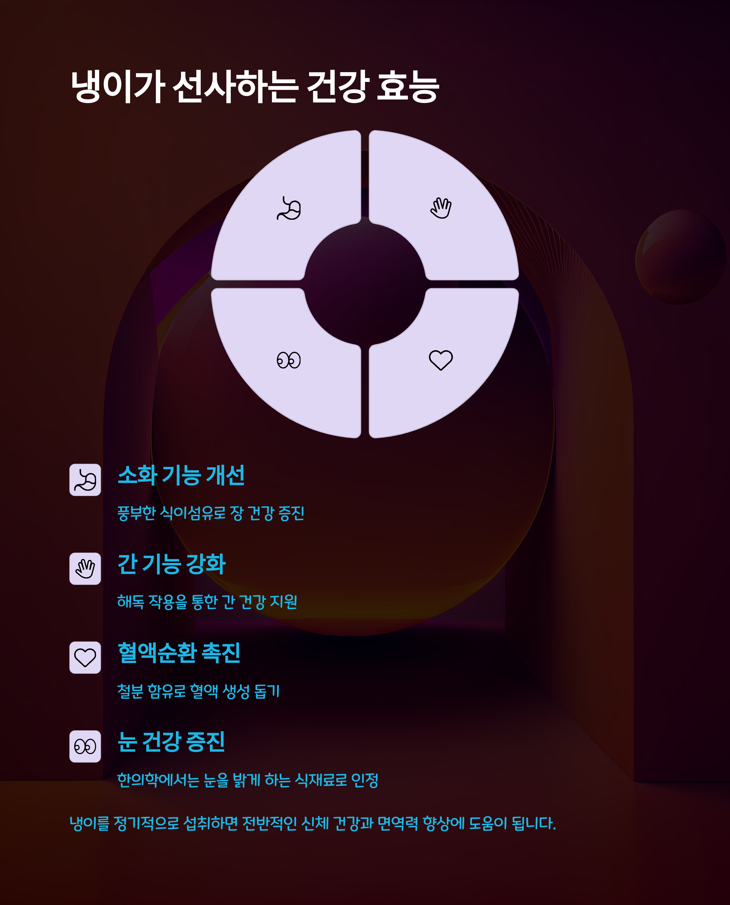 냉이는 천연 피로 회복제라고 불릴 만큼 봄철 기력을 북돋우는 데 탁월합니다. 비타민 B1은 피로 회복에 도움을 주고, 냉이의 쌉쌀한 맛은 입맛을 돋우어 봄철 식욕부진을 해소하는 데 효과적이에요.