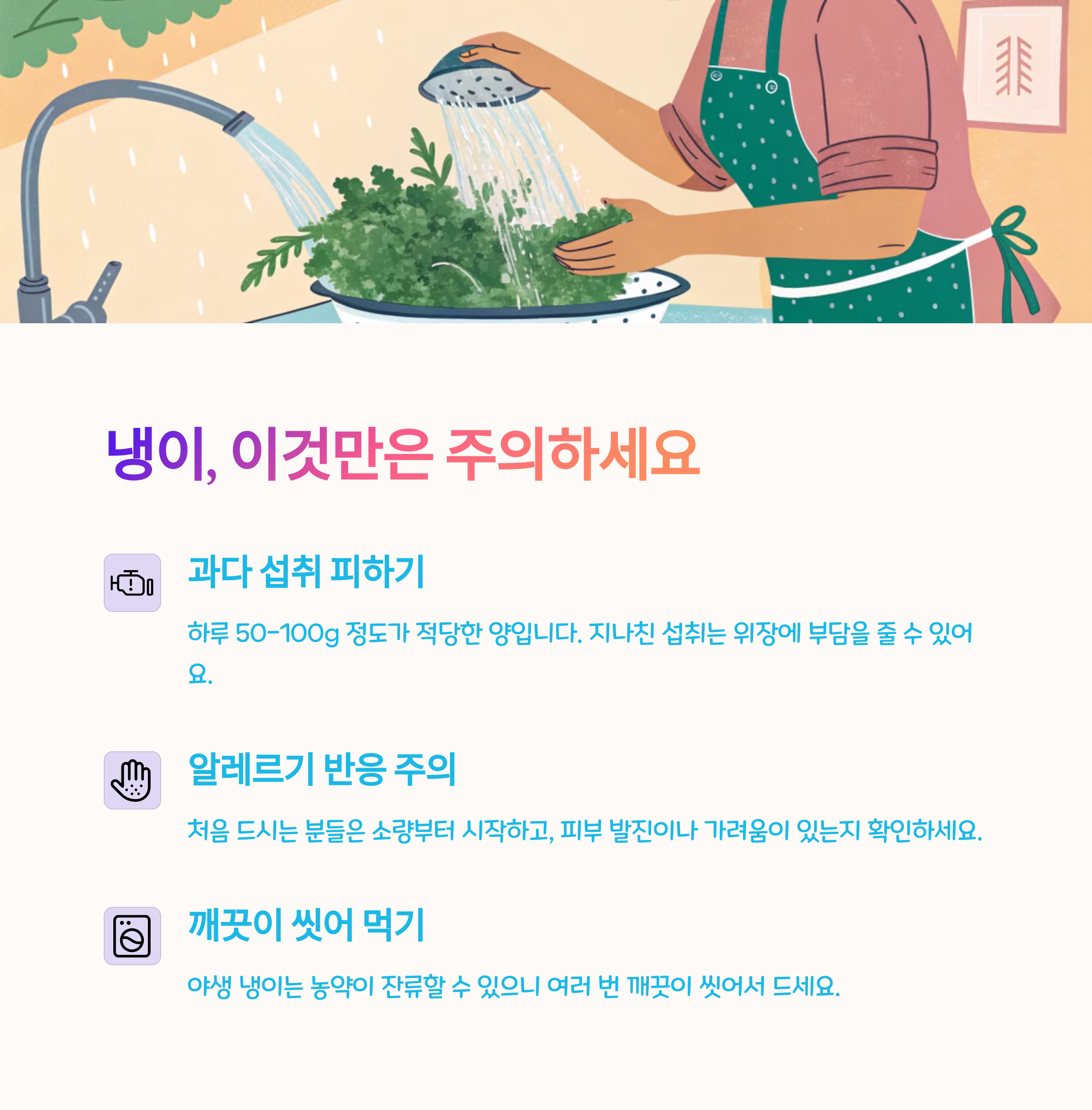 - 위장 문제: 소화기가 예민한 분들은 냉이를 충분히 익혀 드시는 것이 좋습니다.