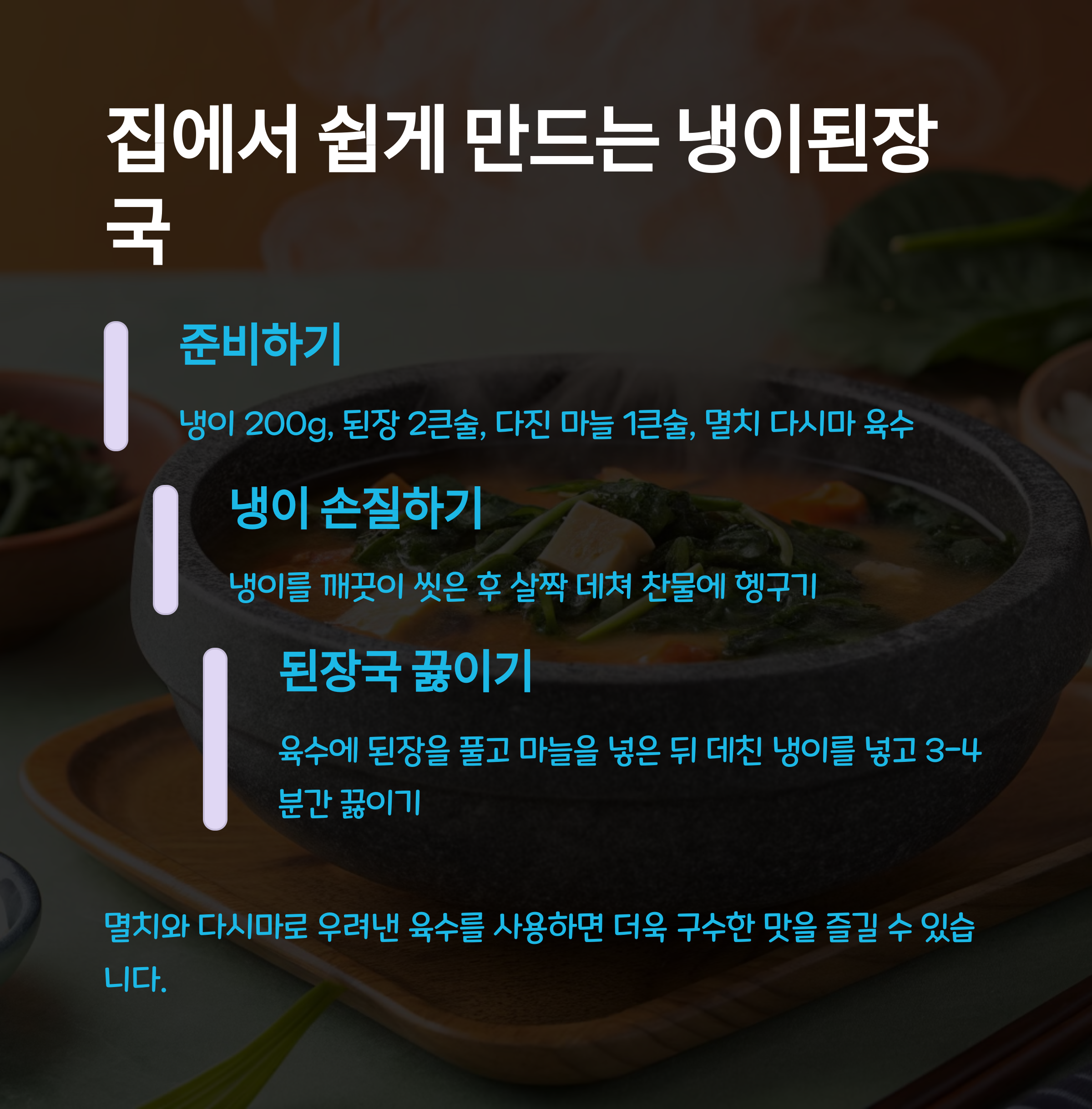 냉이된장국을 끓일 때 중요한 팁은 뿌리도 함께 넣어야 냉이 본연의 맛을 즐길 수 있다는 점이에요. 또한 쌀뜨물을 사용하면 국물이 더 구수해집니다.