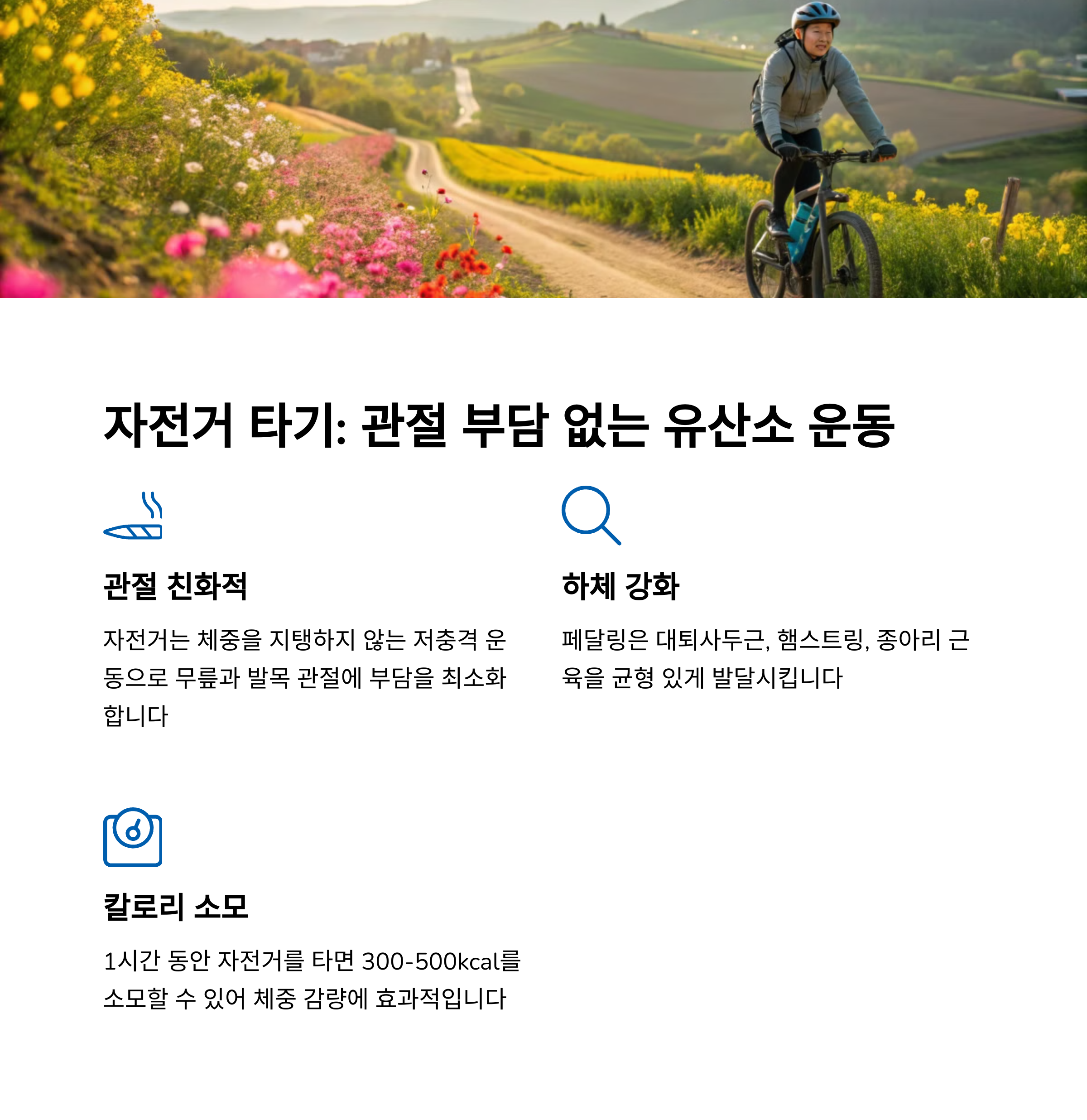 자전거 타기는 저충격 유산소 운동으로, 봄철 야외에서 즐길 수 있는 최고의 활동 중 하나입니다.