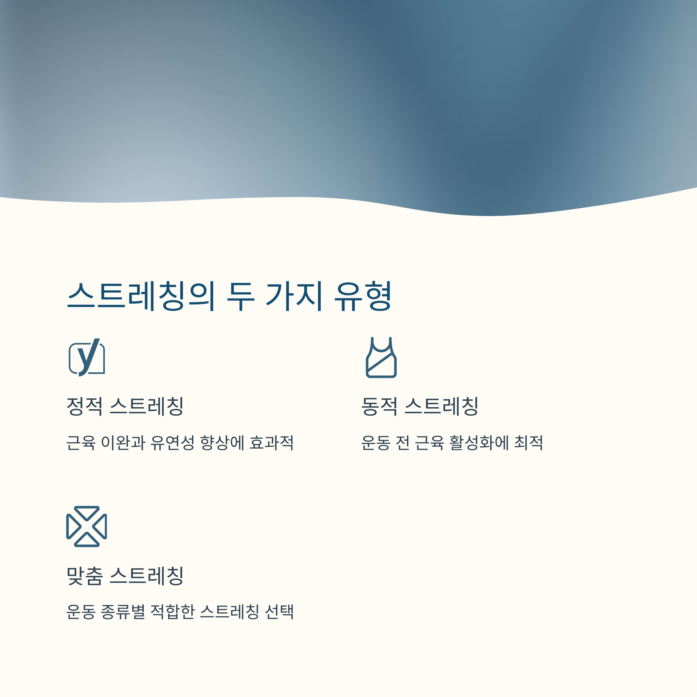 웜업 후에는 스트레칭을 통해 근육과 관절을 더 유연하게 만들어줍니다. 스트레칭에는 정적 스트레칭과 동적 스트레칭이 있습니다.