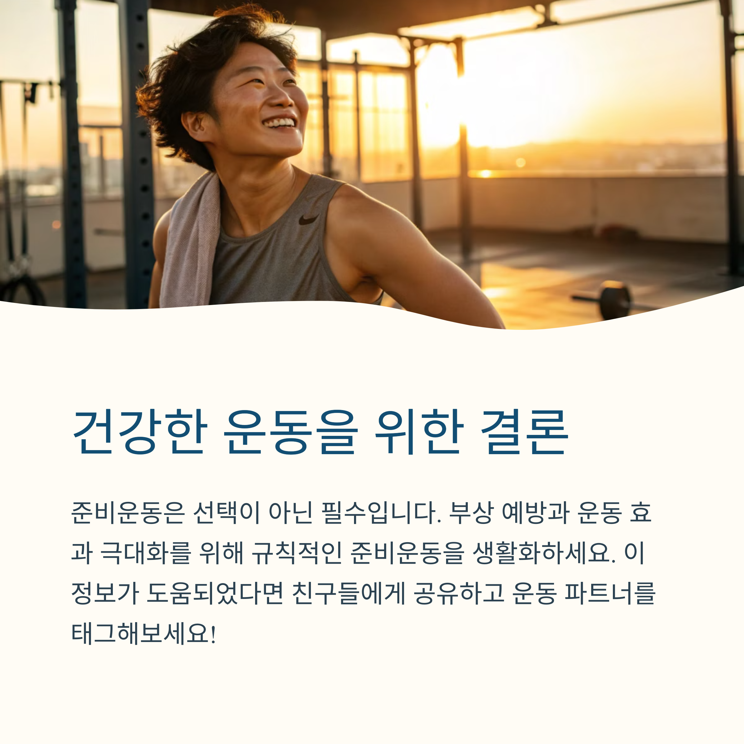 준비운동은 단순히 부상을 예방하는 것을 넘어, 운동의 효과를 극대화하고 건강한 운동 습관을 형성하는 데 중요한 역할을 합니다. 오늘부터 준비운동을 생활화하여 더 건강하고 효과적인 운동을 즐겨보세요!