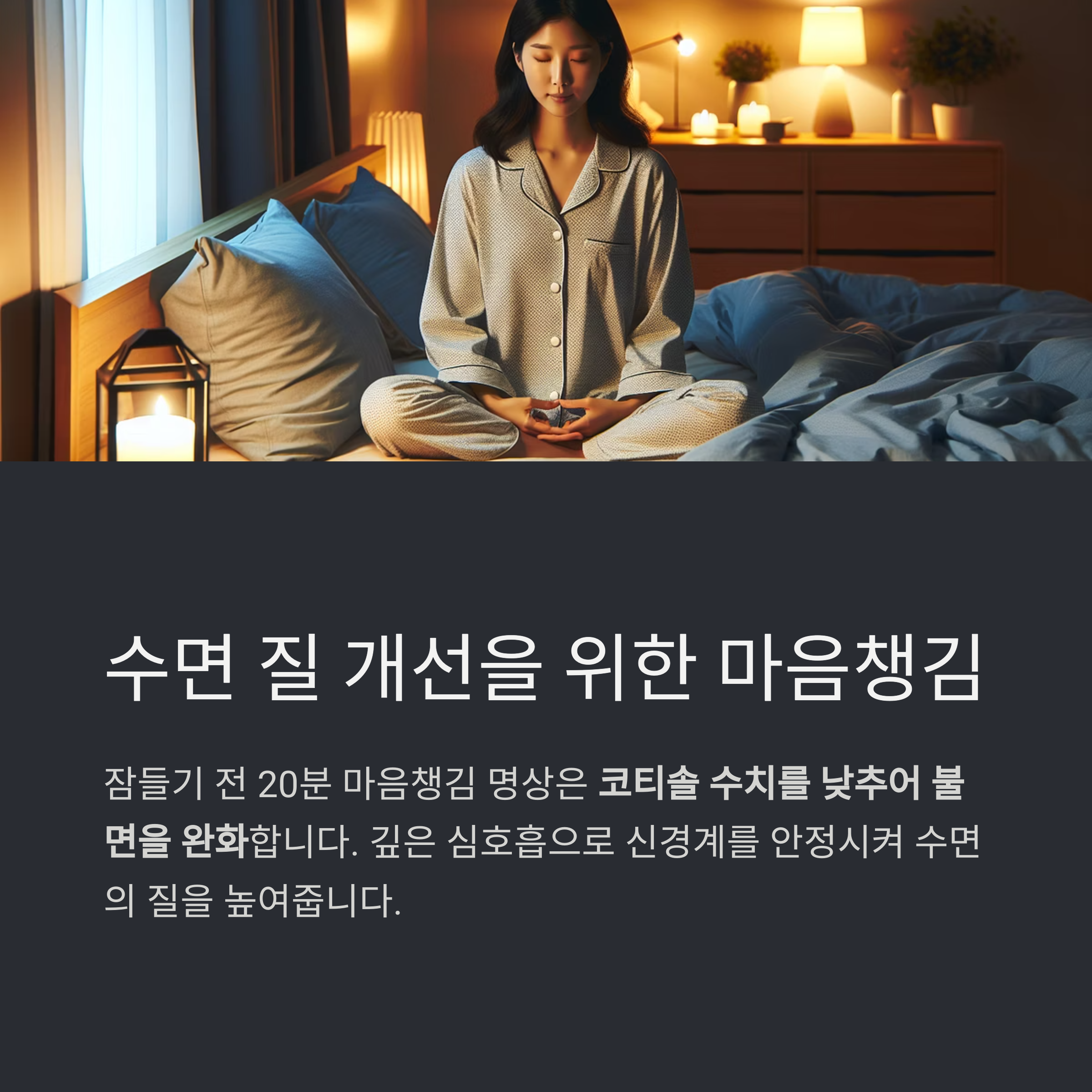 잠들기 전 20분 마음챙김 명상은 코티솔 수치를 낮추어 불면을 완화할 수 있습니다.