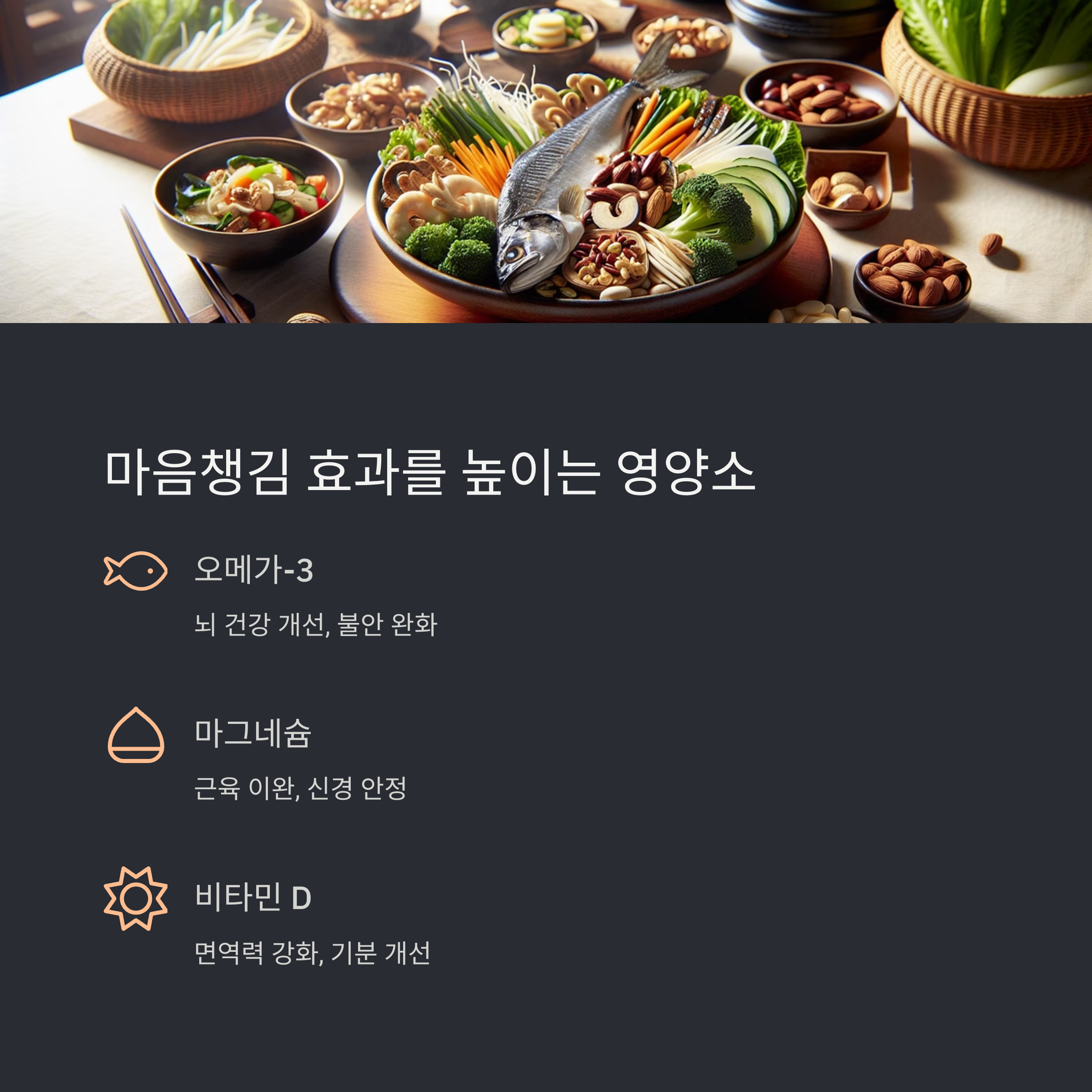 | 오메가-3 | 뇌 건강 개선, 불안 완화 | 생선 기름, 영양제 |