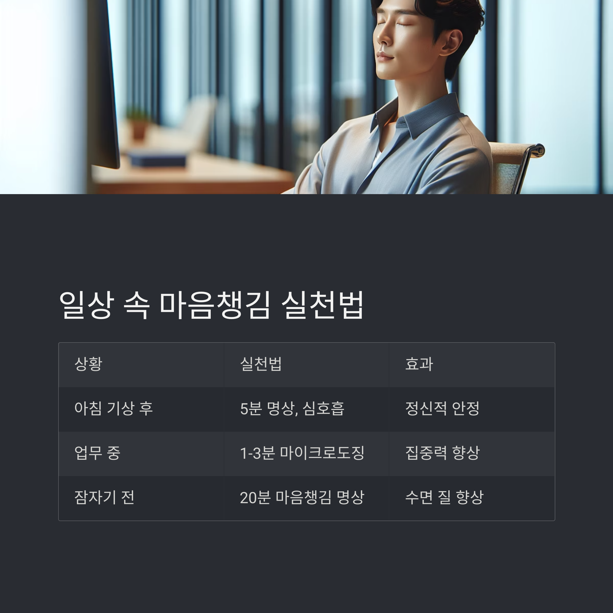 | 업무 중 | 1~3분 마이크로도징 명상, 현재 순간 인식 | 집중력 향상, 스트레스 완화 |