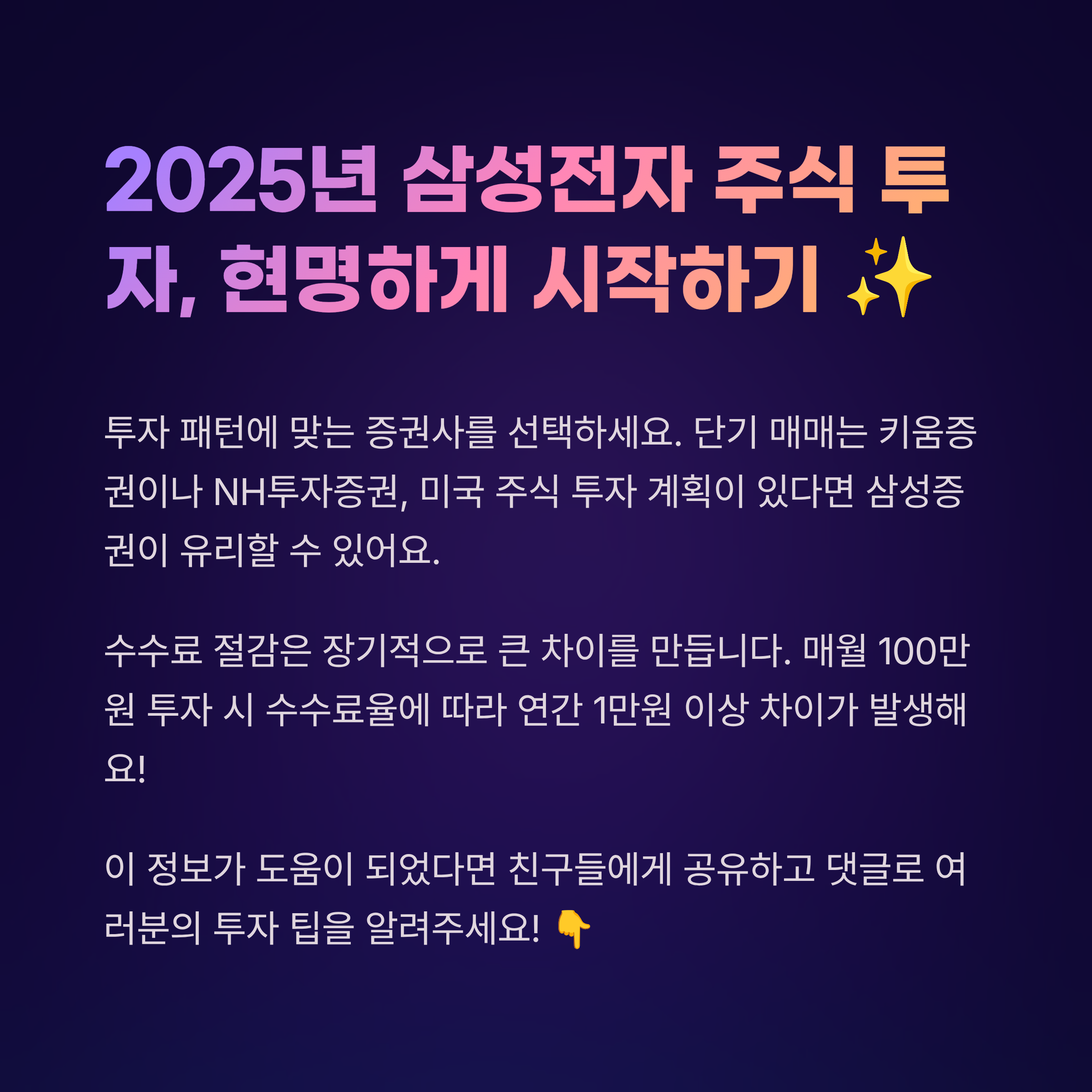이상으로 2025년 삼성전자 주식 매수에 대한 증권사별 수수료와 이벤트를 총정리해 드렸습니다. 성공적인 투자를 위해 이 정보를 적극 활용해 보시길 바라요! 😊
