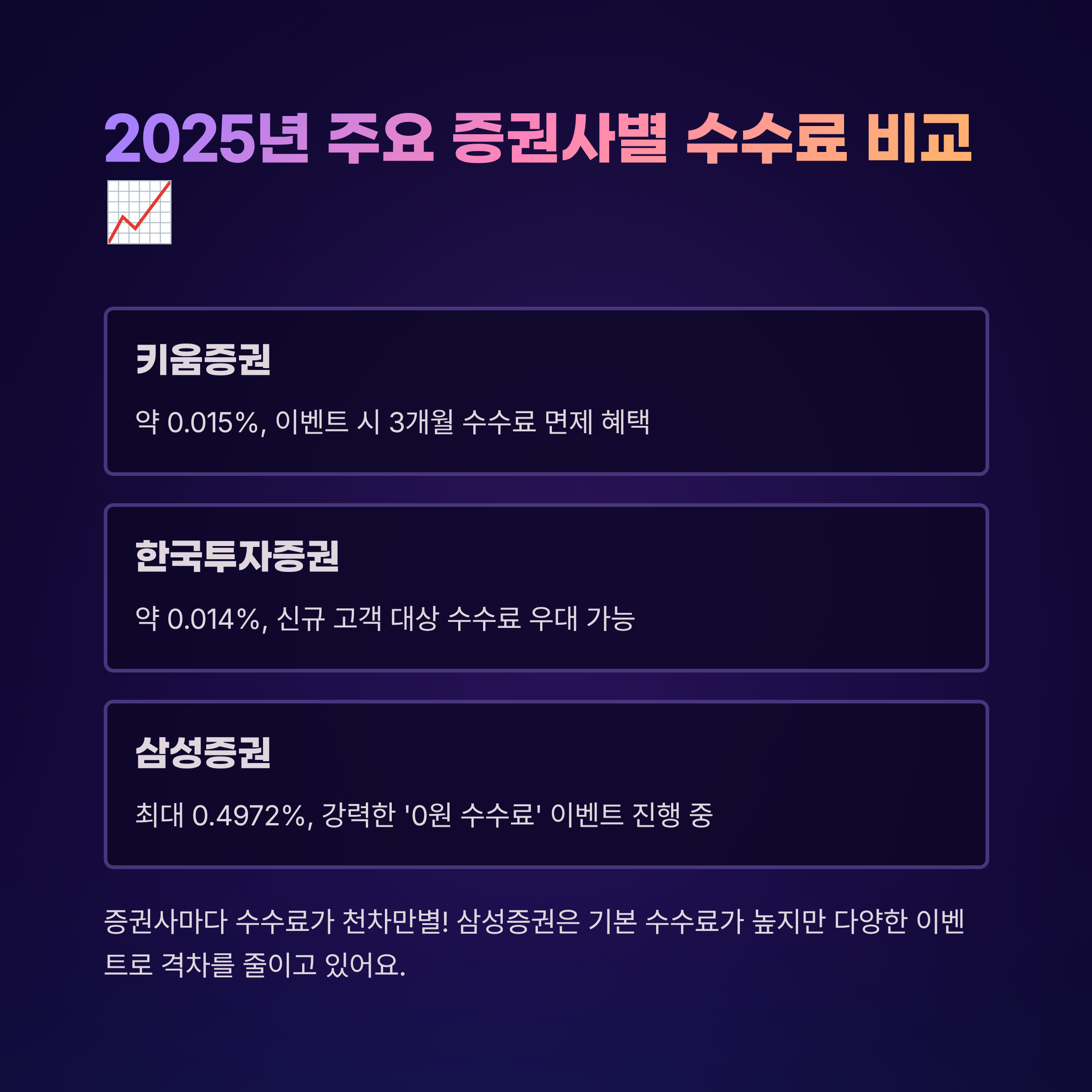 삼성전자 주식, 드디어 투자를 시작하기로 마음먹으셨나요? 🎉 저도 처음 주식 투자를 시작할 때 이것저것 따져보느라 머리가 아팠던 기억이 나네요. 특히, "수수료"라는 복병이 생각보다 큰 부담으로 다가오더라고요. 매수하고 매도할 때마다 수수료가 계속 쌓이다 보면, 나중에 생각지도 못한 비용이 되곤 하잖아요? 그래서 오늘은 2025년 최신 정보를 바탕으로 삼성전자 주식 투자를 위한 증권사별 수수료를 아주 꼼꼼하게 비교해 보려고 합니다. 신규 투자자를 위한 '0원 수수료' 이벤트까지 완벽하게 파헤쳐 드릴 테니, 끝까지 놓치지 마세요! 😉