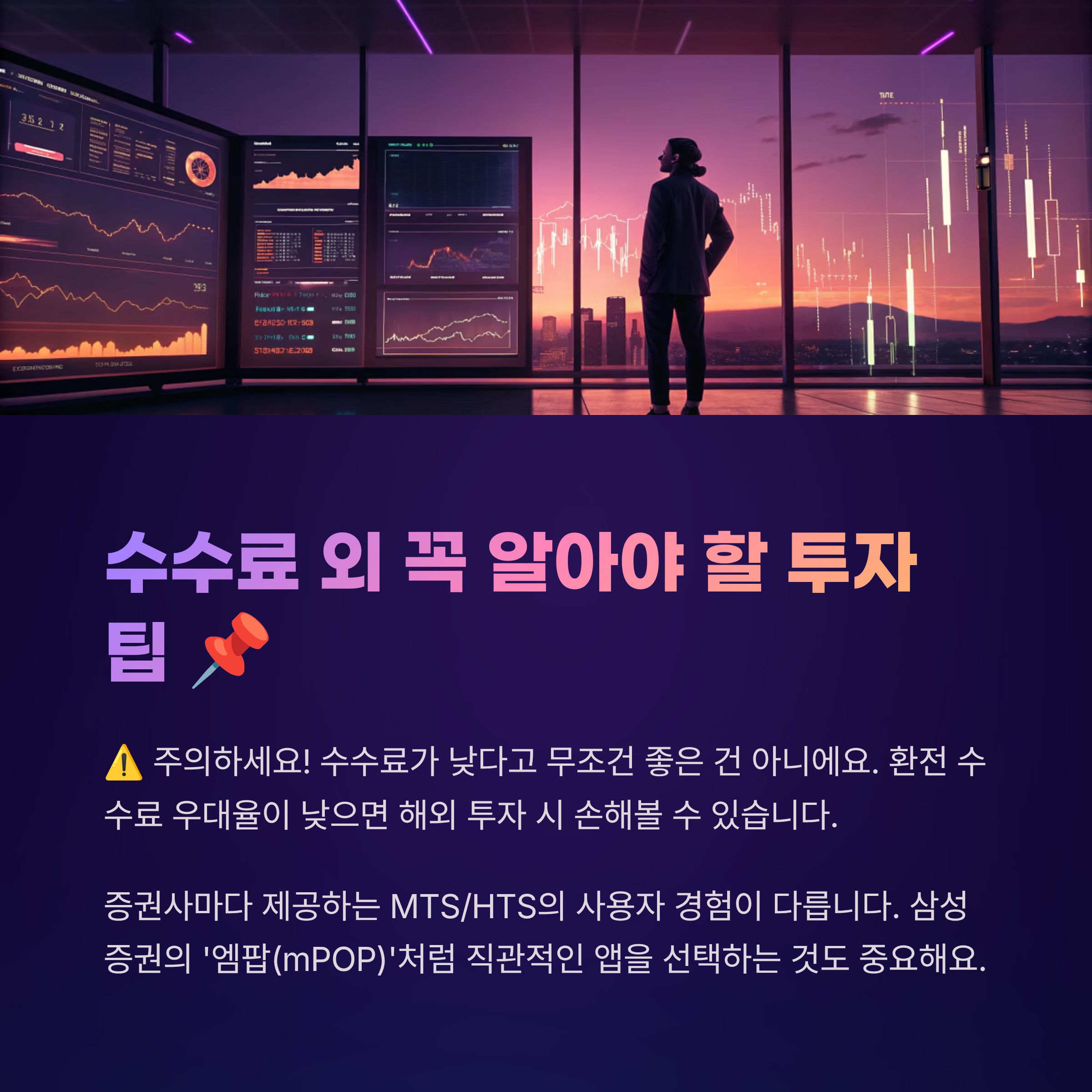 수수료가 낮다고 무조건 좋은 건 아니에요. 환전 수수료 우대율이 낮으면 해외 투자 시 수수료로 아낀 돈을 환전 비용으로 다 낼 수도 있습니다. 삼성증권의 95% 환율 우대 혜택처럼, 수수료와 환전 우대를 함께 고려하는 것이 현명합니다.