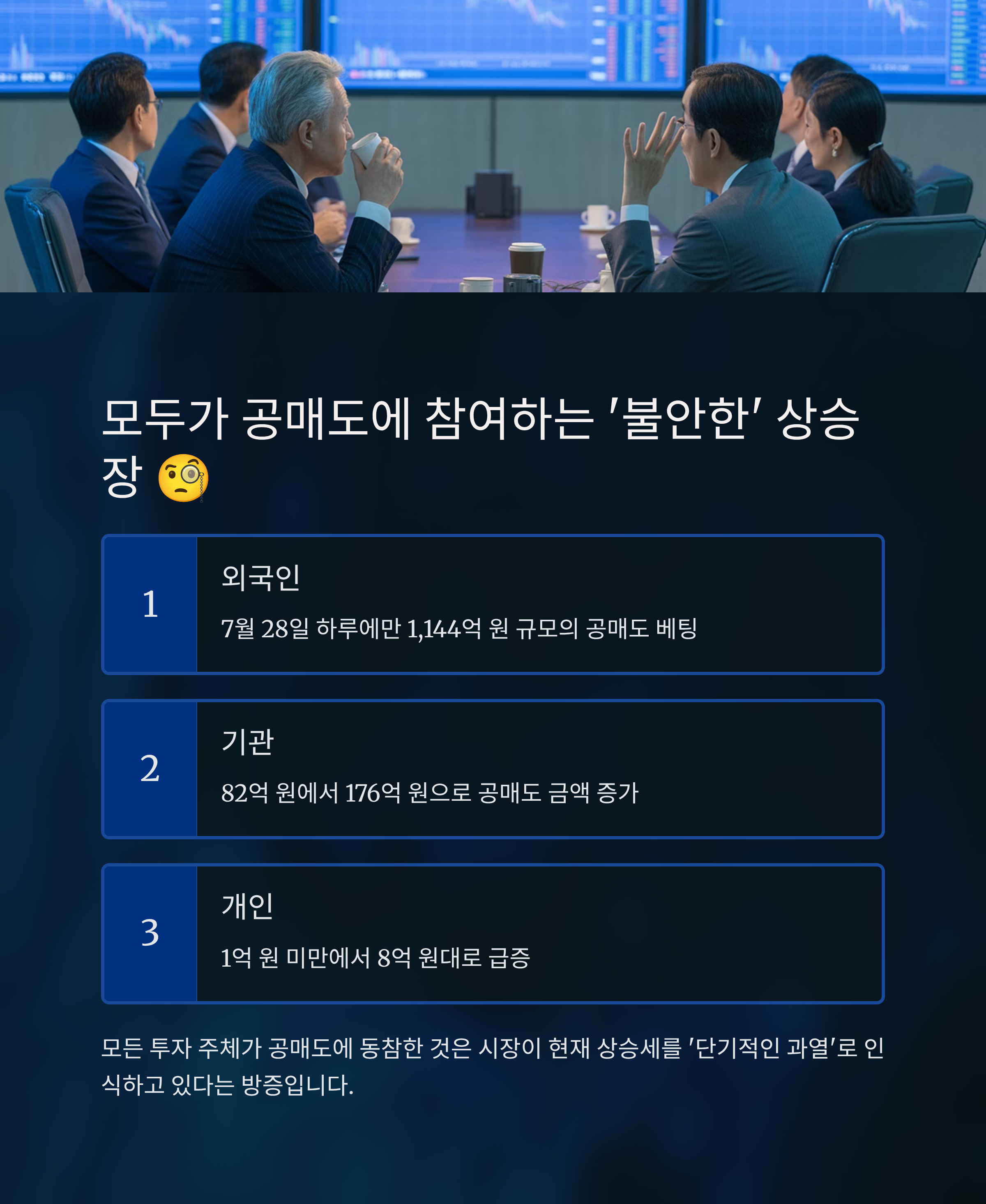 - 외국인: 7월 28일 하루에만 1,144억 원 규모의 공매도 베팅을 진행했습니다.