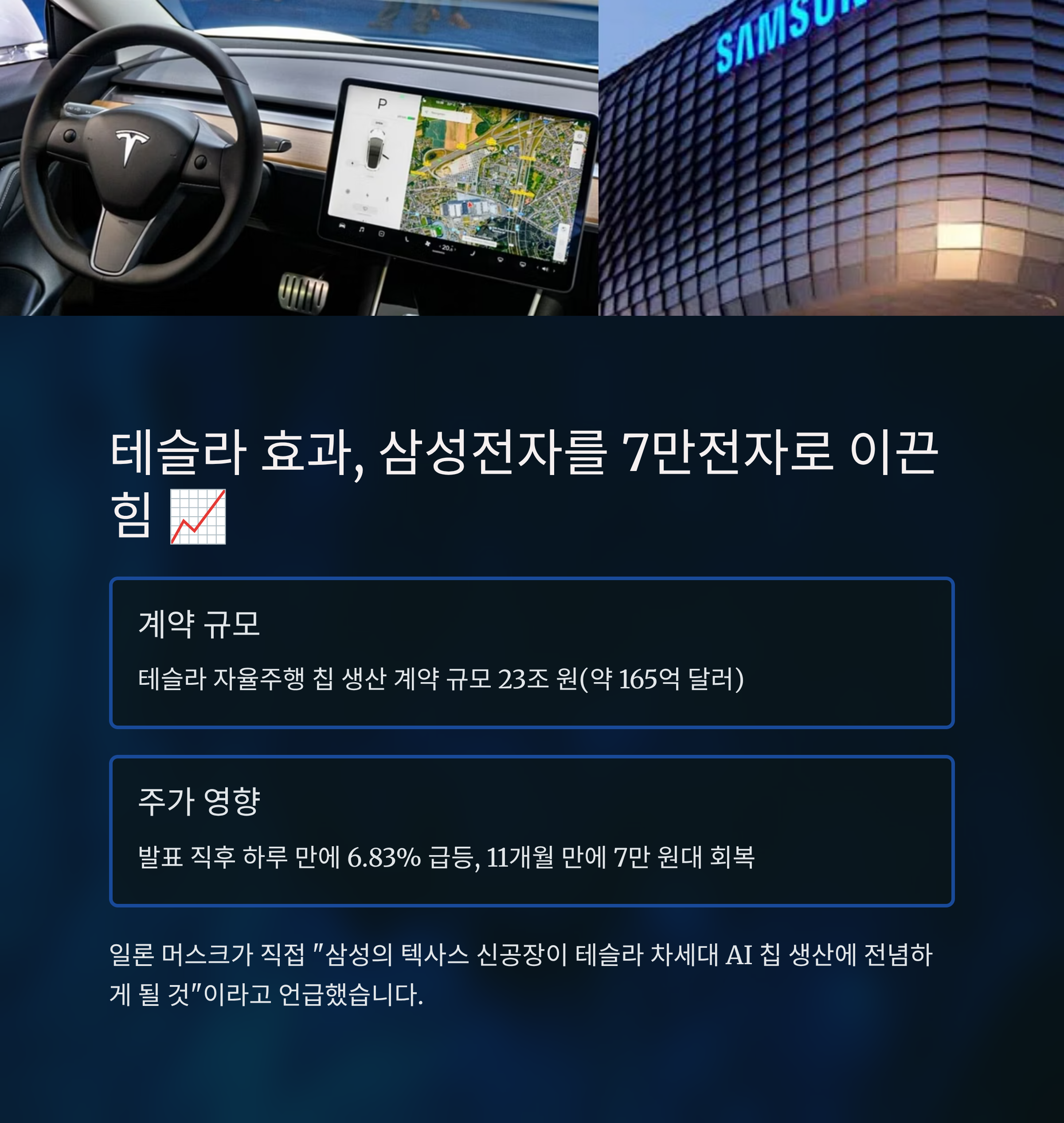- 일론 머스크의 언급: 머스크가 직접 “삼성의 텍사스 신공장이 테슬라 차세대 AI 칩 생산에 전념하게 될 것”이라고 말해 계약의 상징성을 더욱 높였습니다.