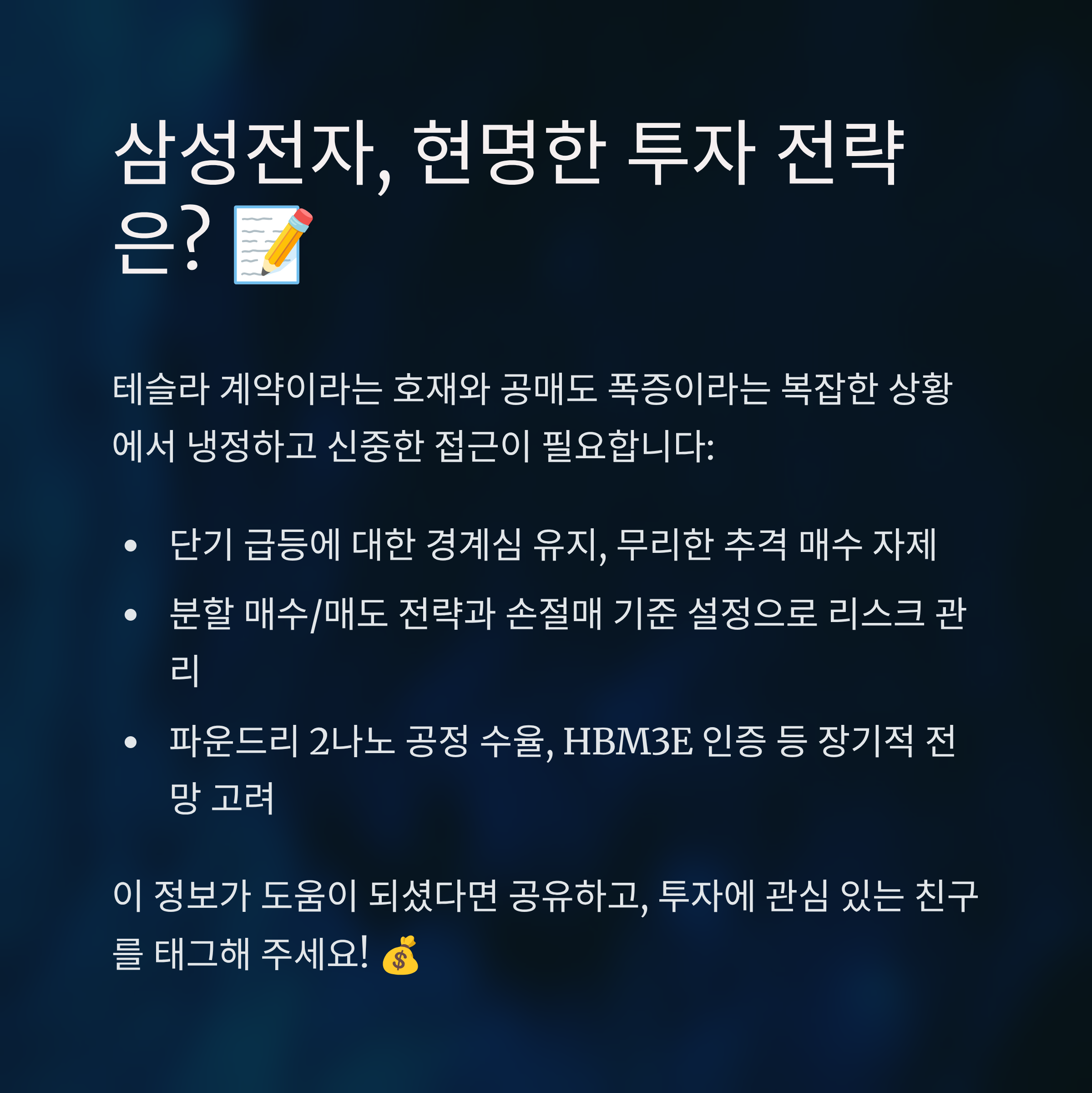 - 중장기적 관점 유지: 테슬라 계약은 분명 긍정적인 신호이지만, 파운드리 2나노 공정 수율, HBM3E 엔비디아 인증 등 아직 해결해야 할 과제들도 남아 있습니다. 삼성전자의 본질적인 성장 동력과 장기적인 전망을 함께 고려해야 해요.