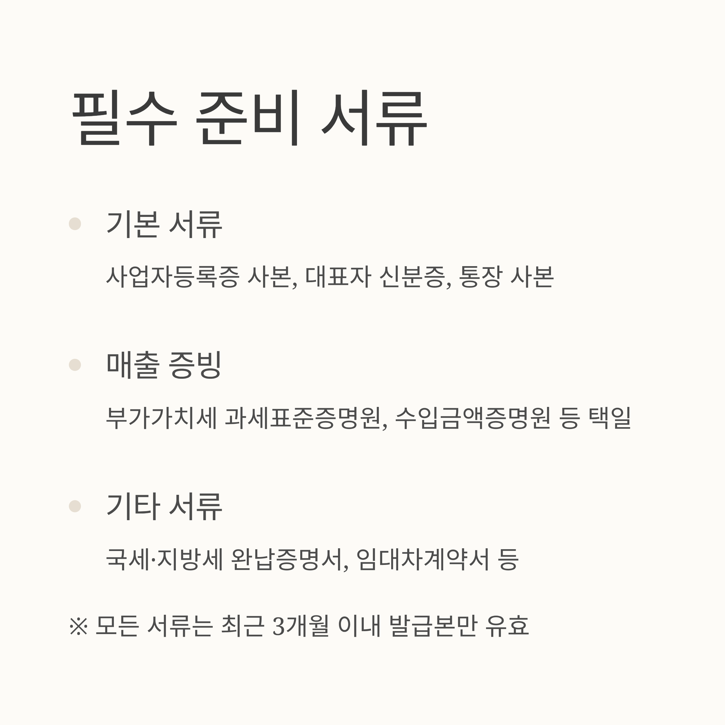 | 기본 서류 | 사업자등록증 사본, 대표자 신분증, 통장 사본 |