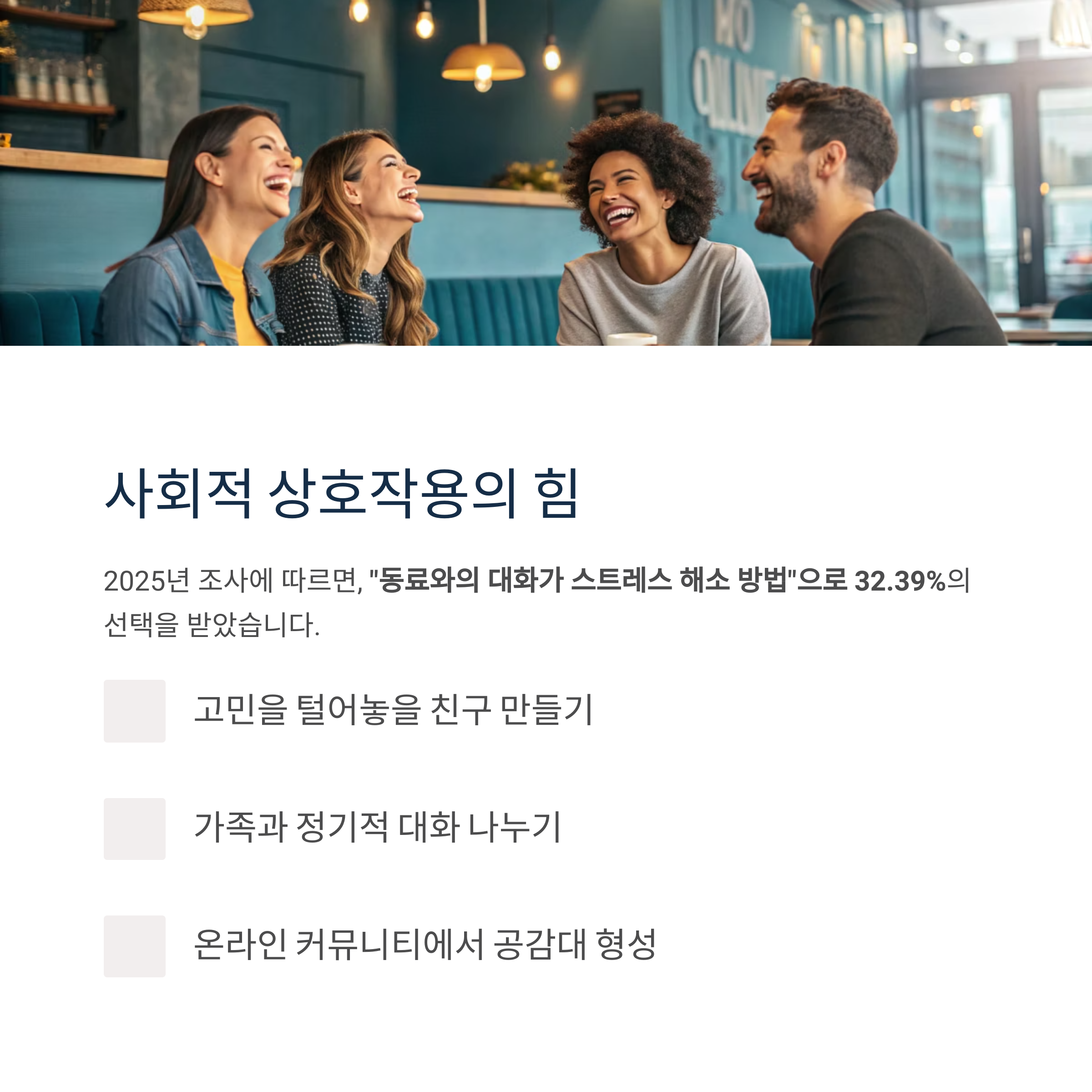 **"동료와의 대화가 스트레스 해소 방법"으로 32.39%**의 선택을 받았습니다.