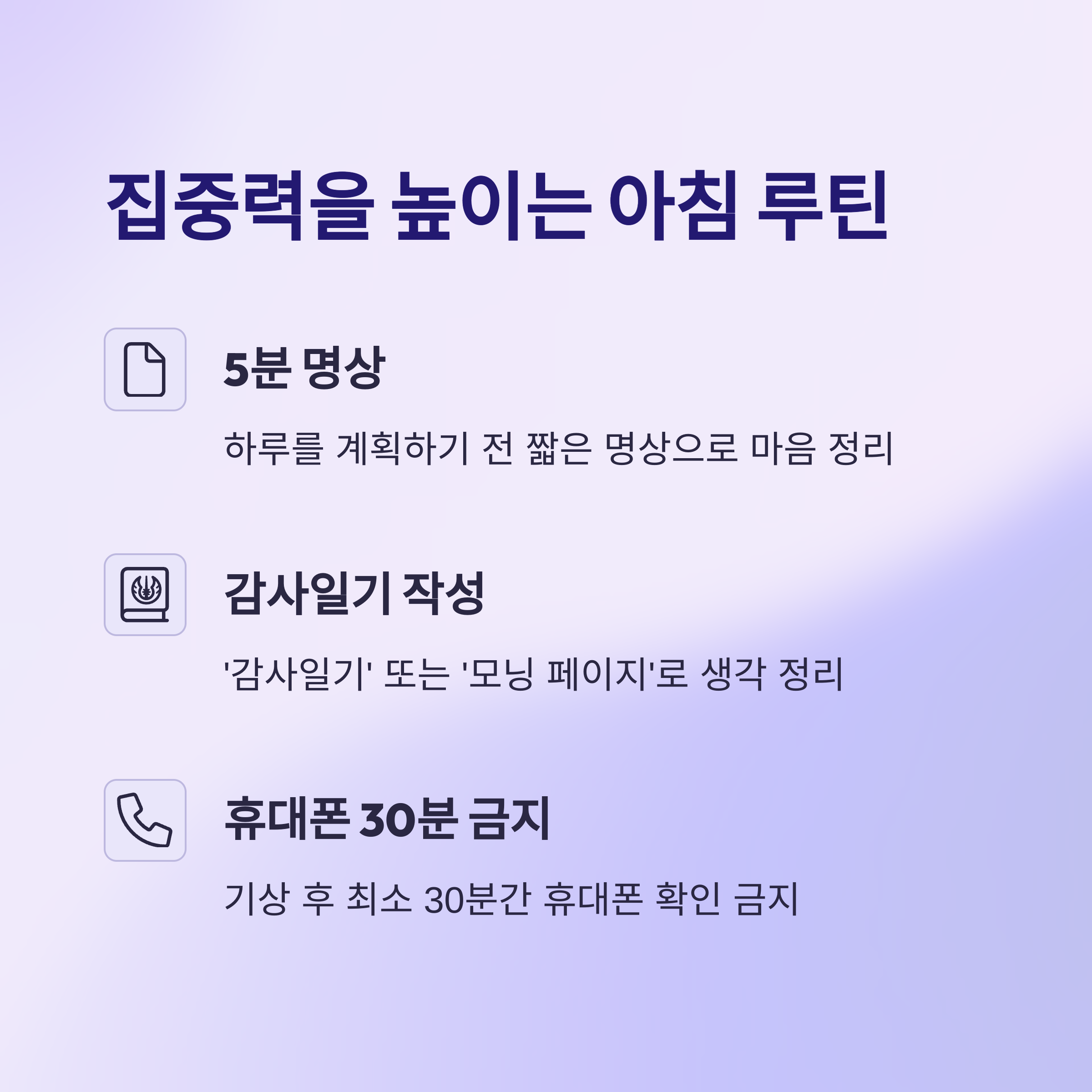 | 휴대폰 사용 제한 | 기상 후 30분간 방해금지모드 |