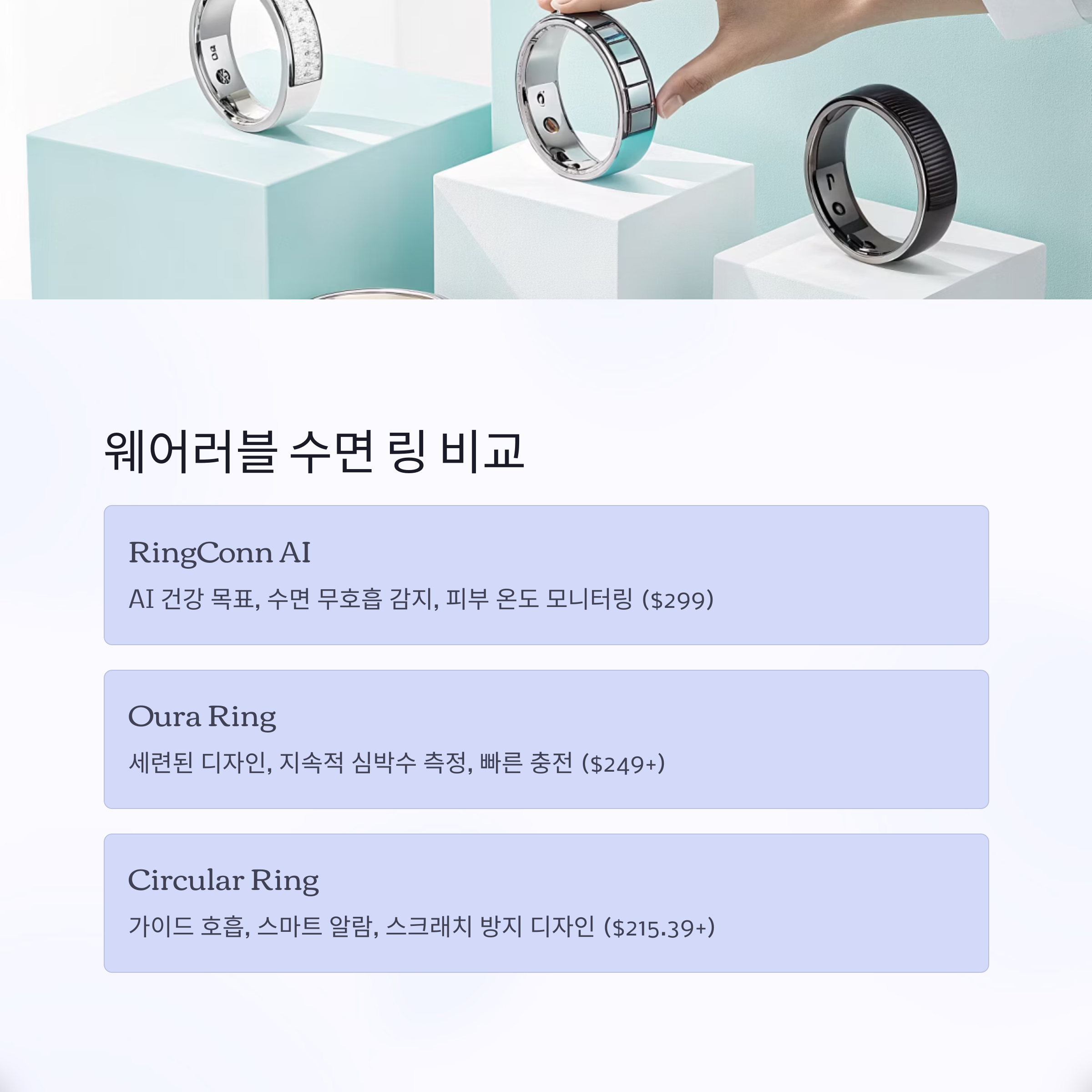 | RingConn | RingConn | AI 건강 목표, 수면 무호흡 감지, 피부 온도 및 호흡률 모니터링 | $299 |