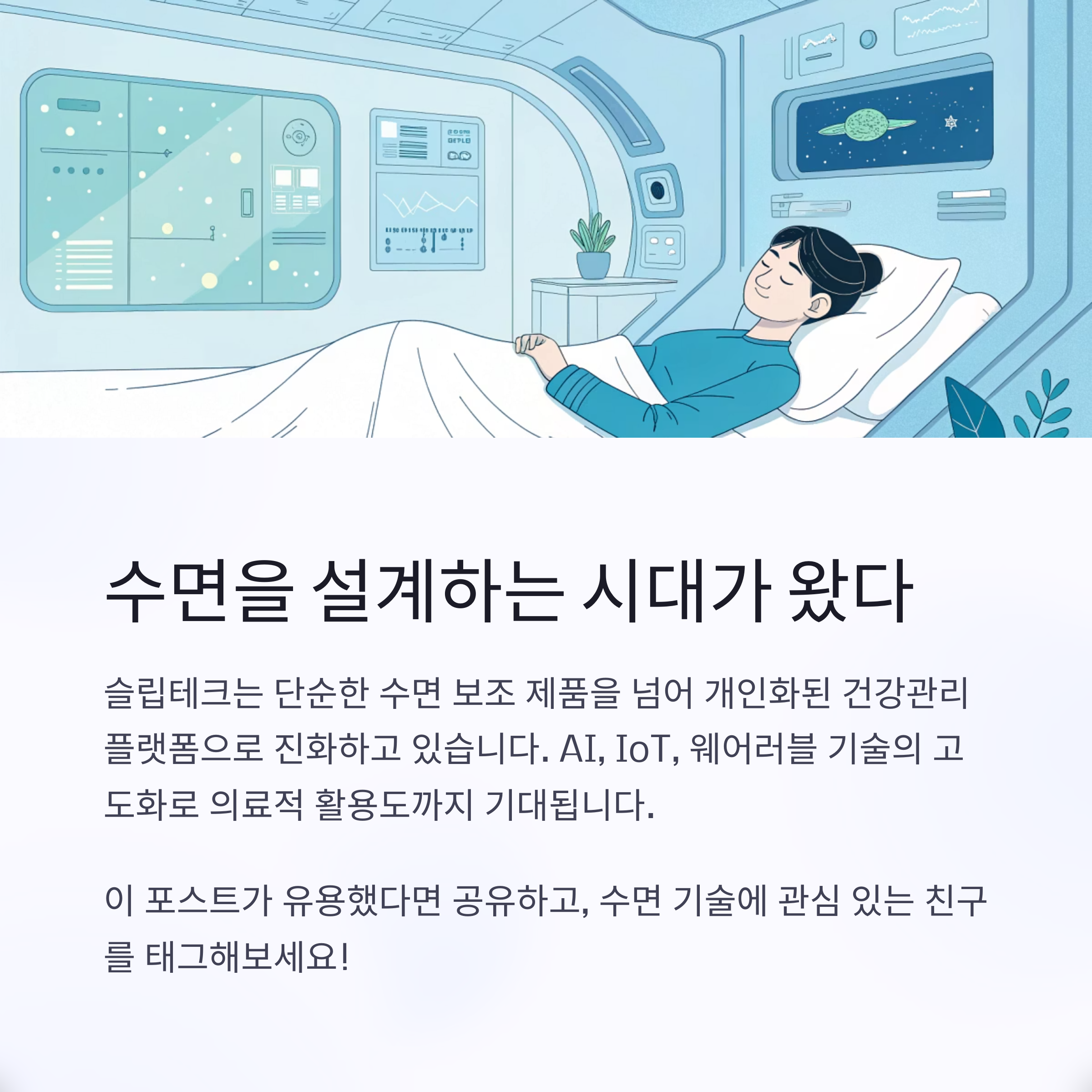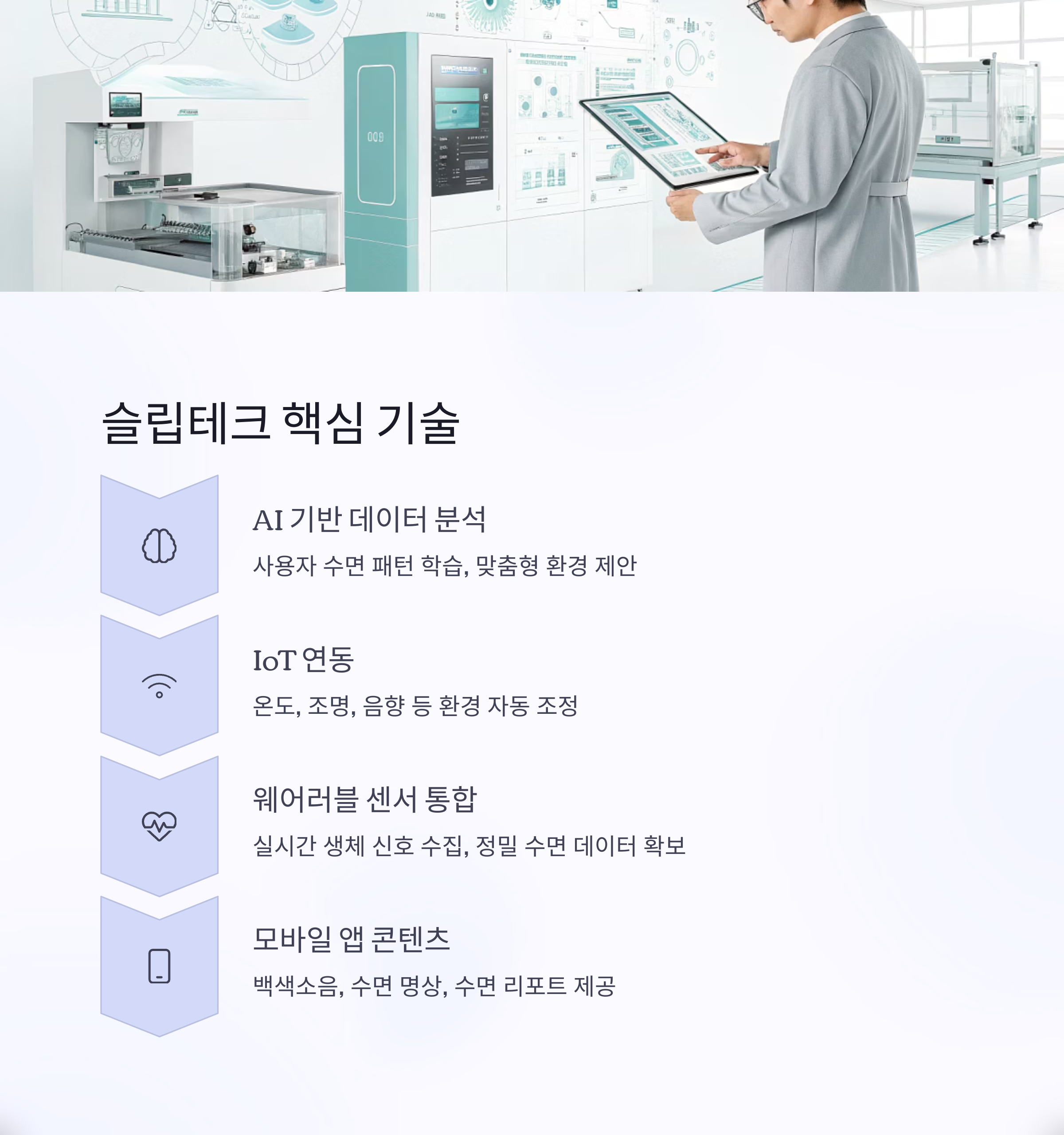 슬립테크는 수면의 질을 향상시키기 위한 기술로, AI·IoT 기반의 웨어러블 기기와 스마트 매트리스 등 다양한 제품이 출시되고 있습니다.