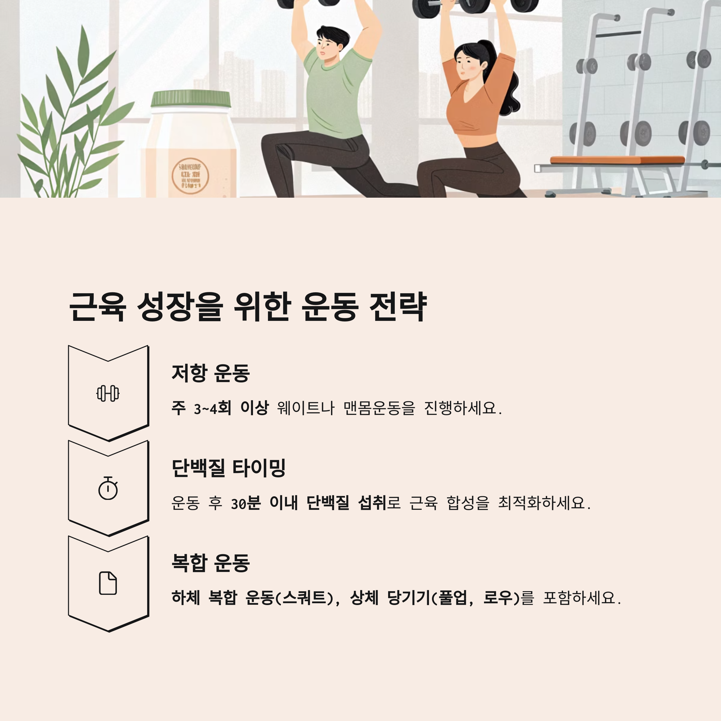 운동 후 30분 이내 단백질 섭취로 근육 단백질 합성을 최적화합니다.