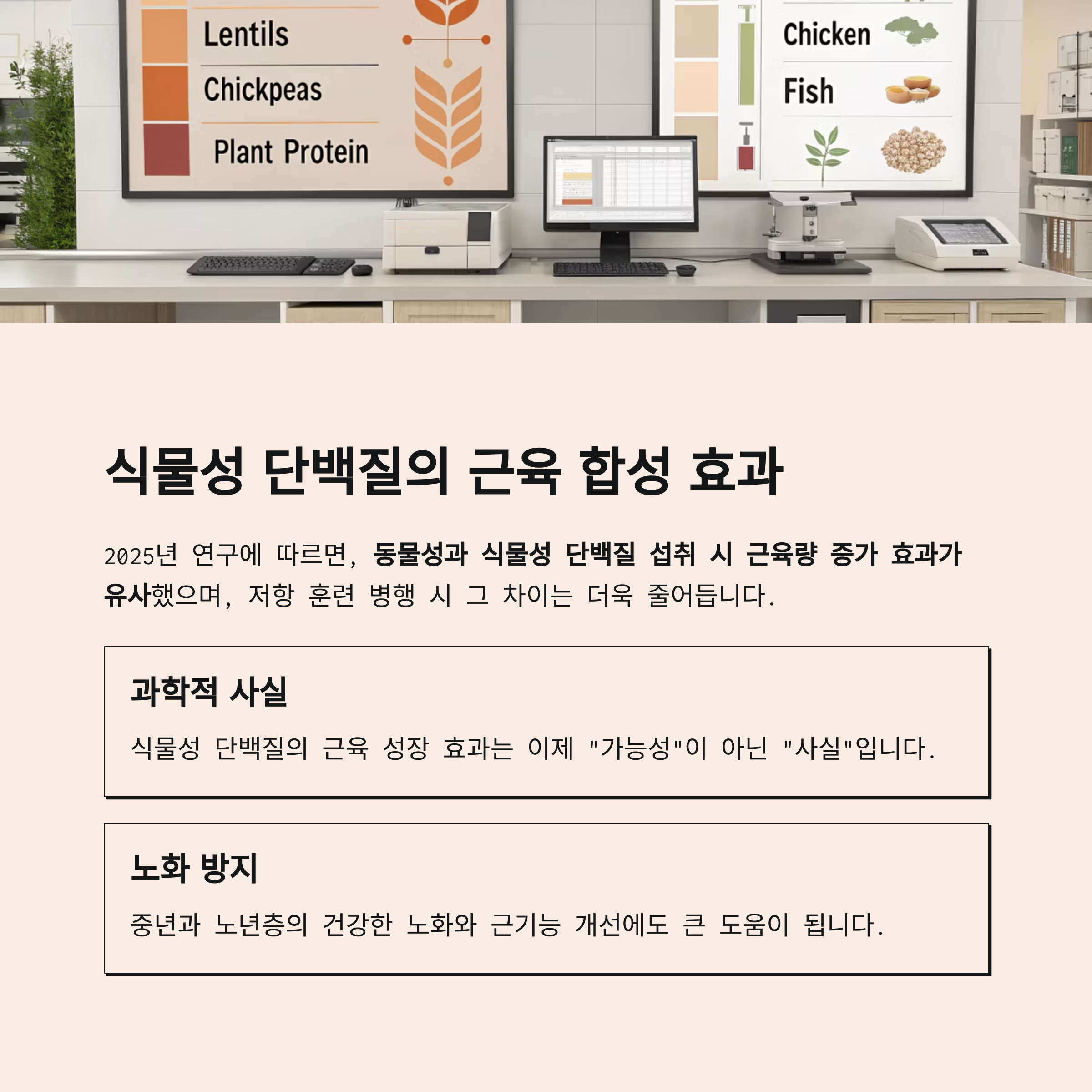 2025년 연구에 따르면, 동물성과 식물성 단백질을 동일량 섭취했을 때 근육량 증가 효과가 유사했으며,