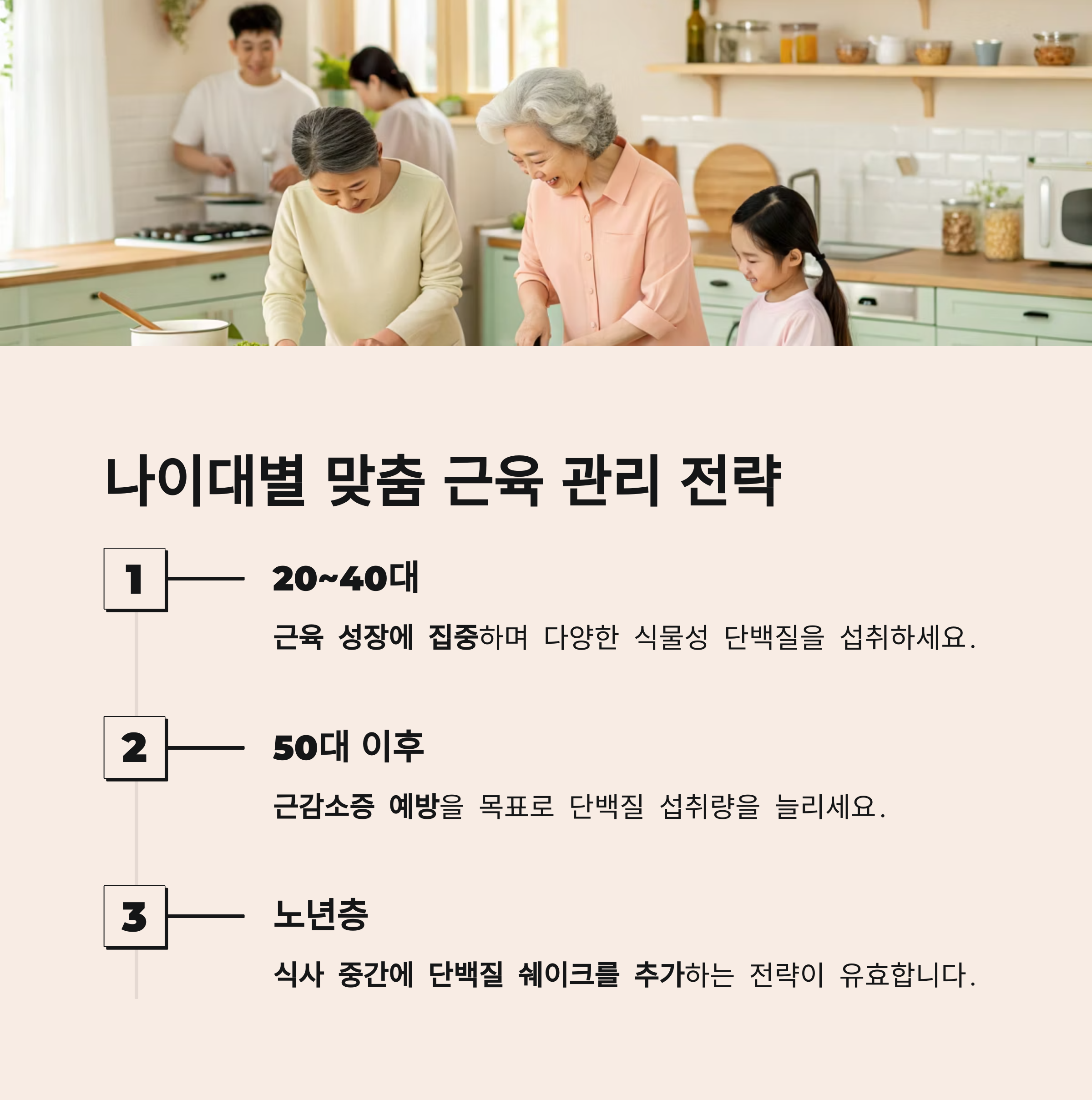 20~40대는 근육 성장에 집중, 50대 이후는 근감소증 예방을 목표로 삼습니다.