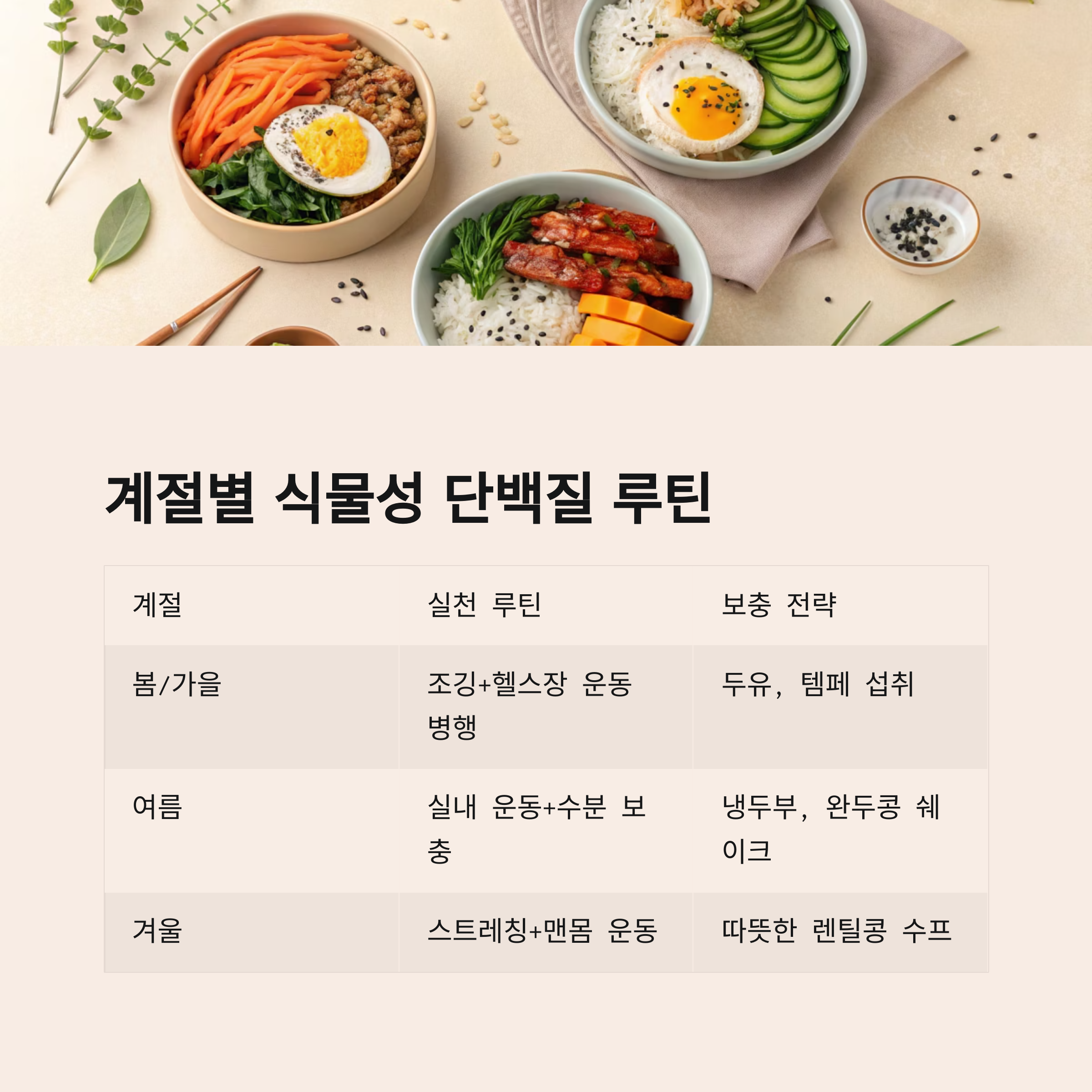 | 봄/가을 | 조깅+헬스장 운동 병행 | 두유, 템페 섭취 |