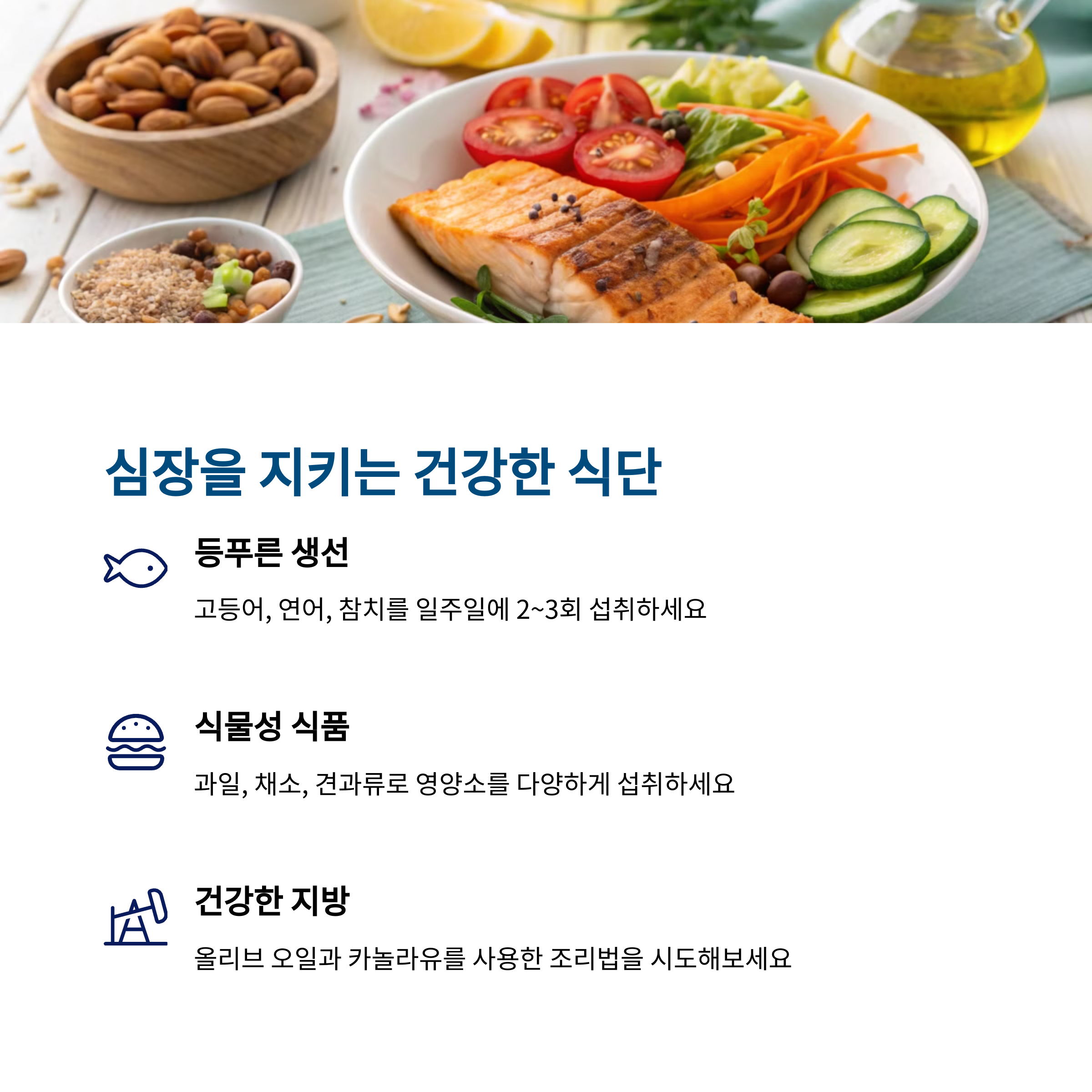 심장 건강에 효과적인 식단은 등푸른 생선뿐 아니라, 전반적인 균형 잡힌 식습관을 포함해야 합니다. 식물성 식품 위주의 식사, 불포화 지방의 활용, 건강한 단백질 섭취는 혈관과 심장의 기능을 향상시키는 핵심 요소입니다. 무엇보다 꾸준한 실천이 가장 중요하며, 일상 속 식단에 작은 변화만 주어도 심혈관 건강에 큰 차이를 만들 수 있습니다.