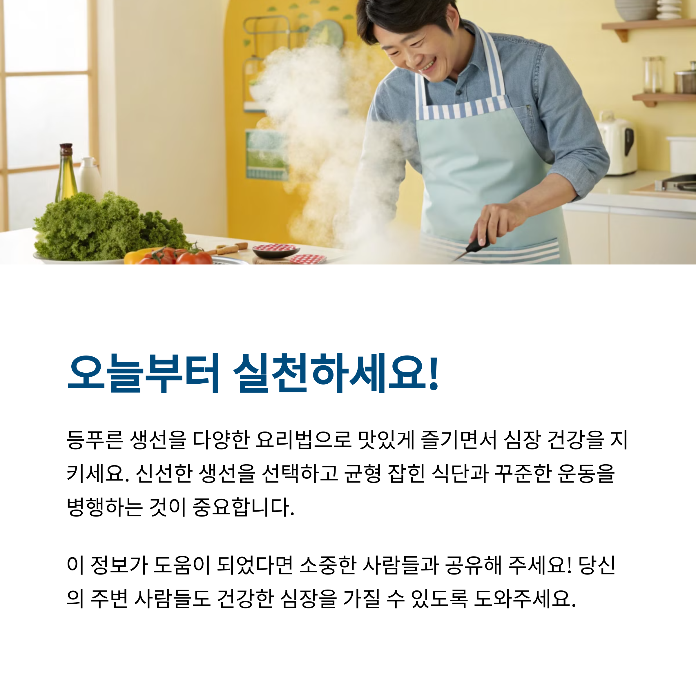심장 건강은 단기간에 이루어지는 것이 아닌, 일상 속 작은 노력이 모여 이루어집니다. 특히 식습관은 그중에서도 가장 중요한 요소로, 등푸른 생선은 심혈관 질환을 예방하는 데 과학적으로 입증된 식재료입니다. 오메가-3 지방산의 이점을 적극 활용하면서 채소와 과일을 충분히 섭취하고 가공식품을 줄이는 생활 습관이 병행된다면 건강한 심장을 오래도록 유지할 수 있습니다. 오늘부터라도 실천 가능한 한 가지 식습관을 바꿔보세요.