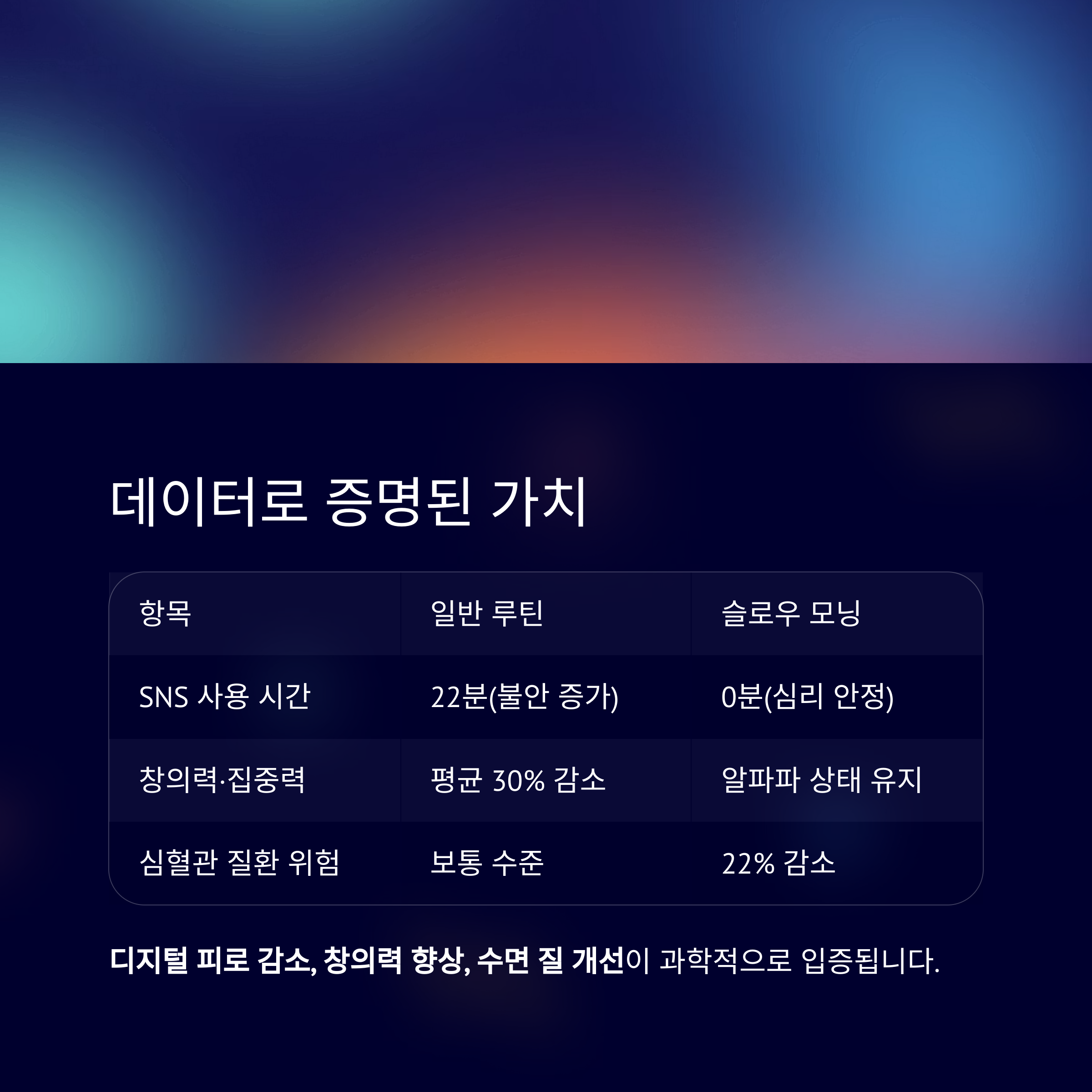 디지털 피로를 줄이고, 창의력을 높이며, 수면의 질까지 개선된다는 과학적 데이터는 슬로우 모닝의 실효성을 입증합니다.
