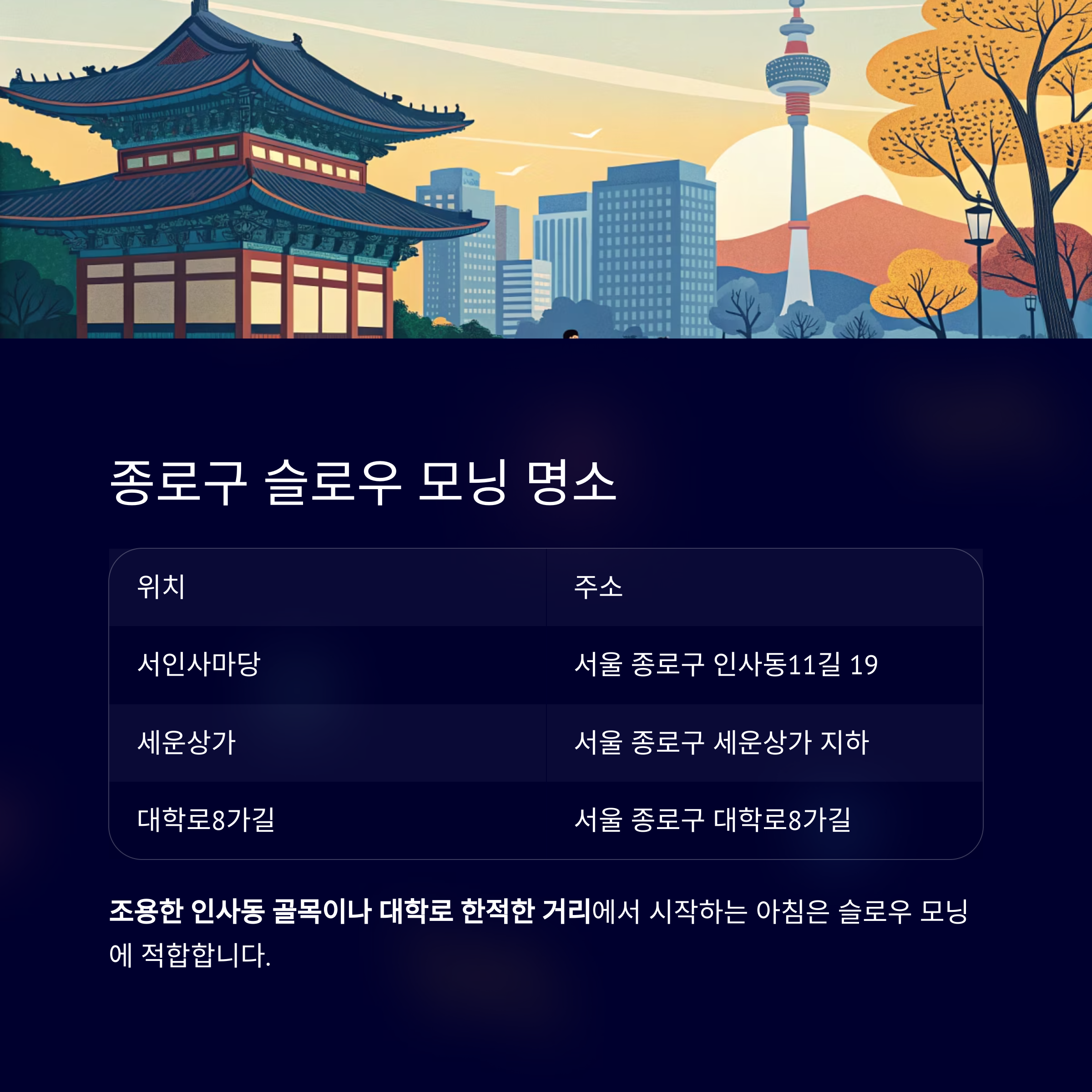 조용한 인사동 골목이나 대학로 한적한 거리에서 시작하는 아침은 슬로우 모닝에 적합한 환경을 제공합니다.