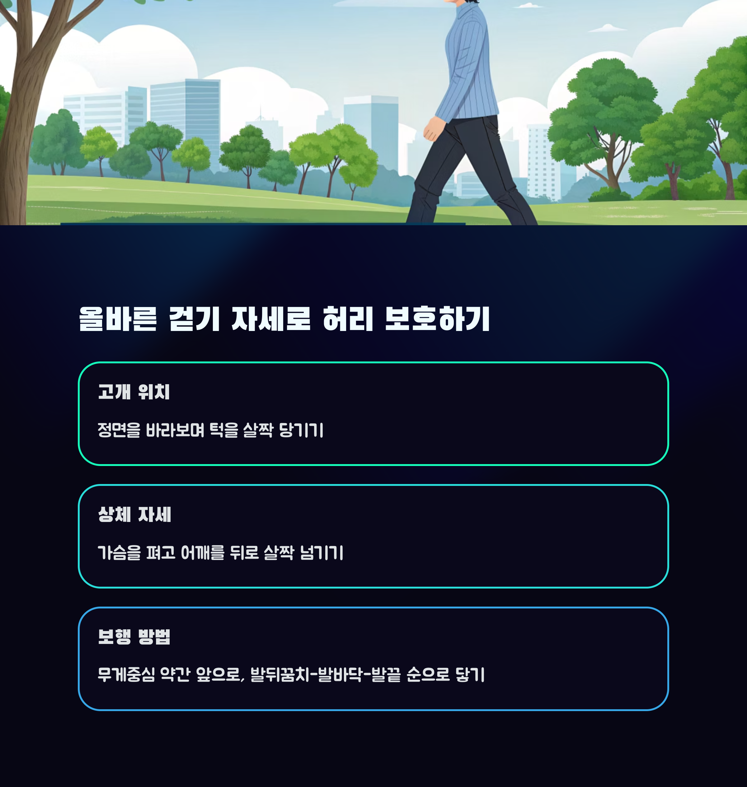 🔍 주의사항: 걷는 중 핸드폰을 보지 마세요. 자세가 쉽게 무너지고, 허리에 불필요한 긴장이 생깁니다.