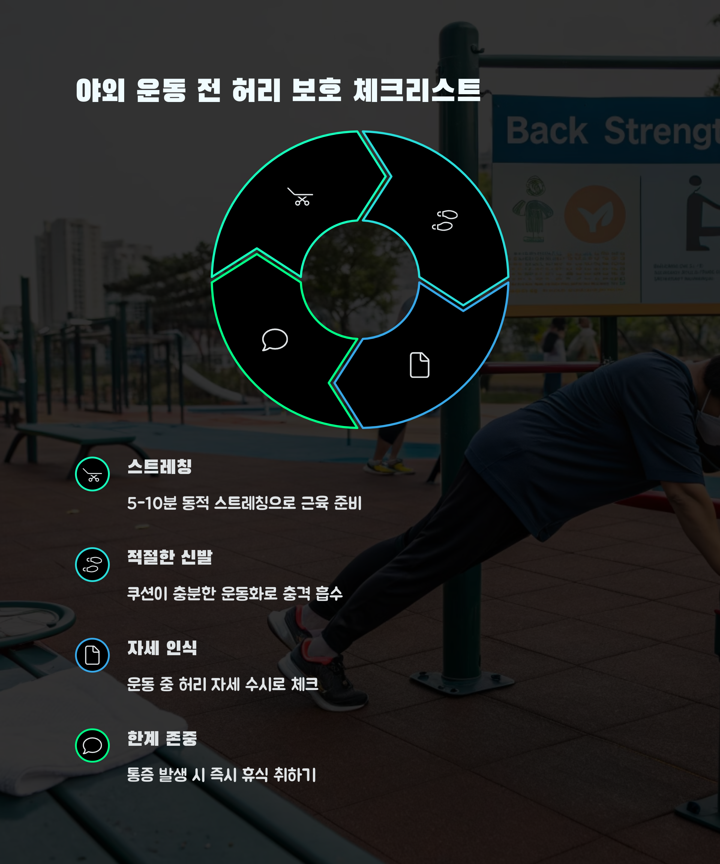 허리 통증 없이 야외 운동을 즐기려면 올바른 자세, 준비운동, 그리고 운동 후 회복까지 전체 루틴을 실천하는 것이 중요합니다.