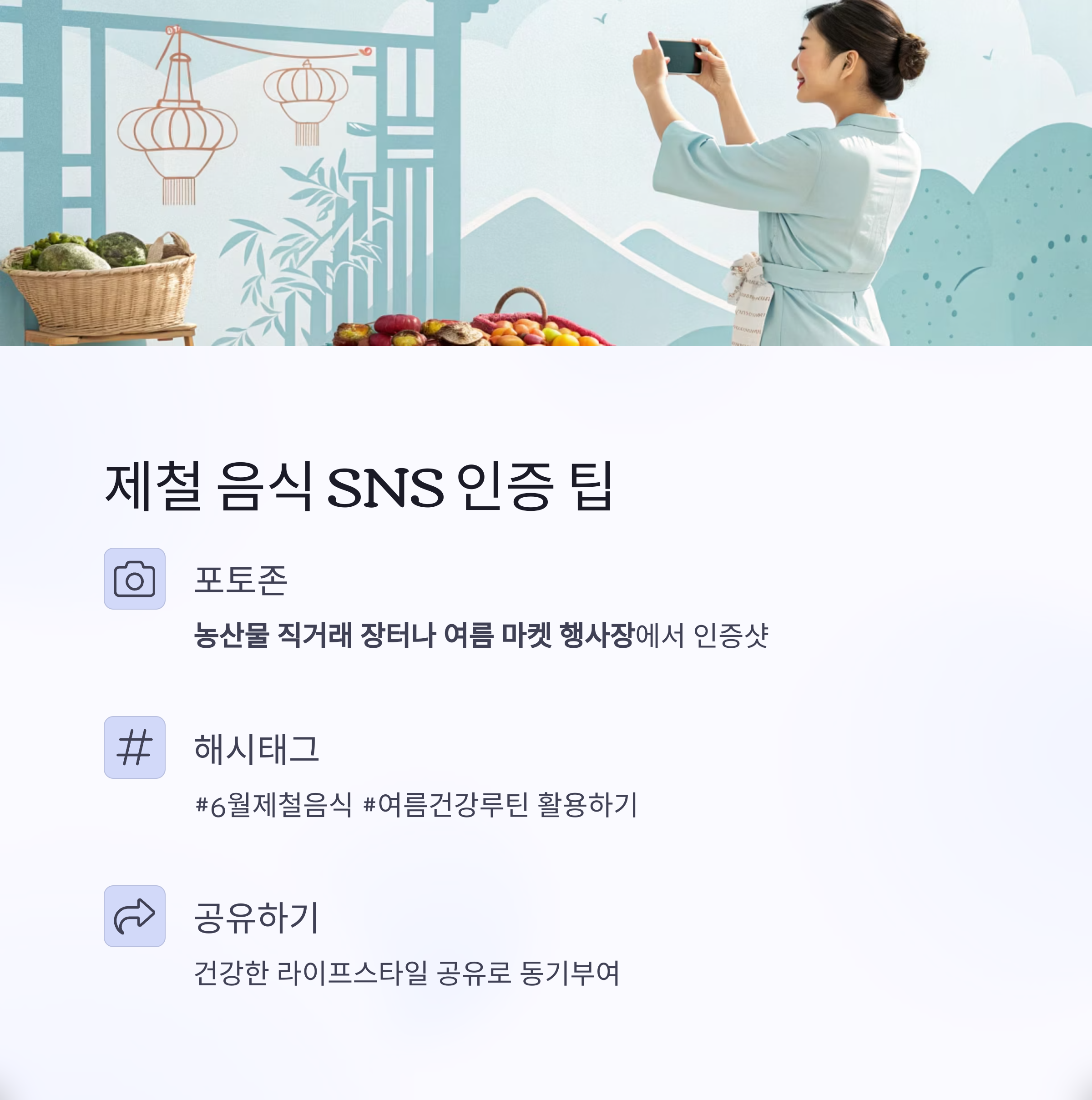 제철 음식 인증샷과 함께 #6월제철음식 #여름건강루틴 등의 해시태그를 활용해