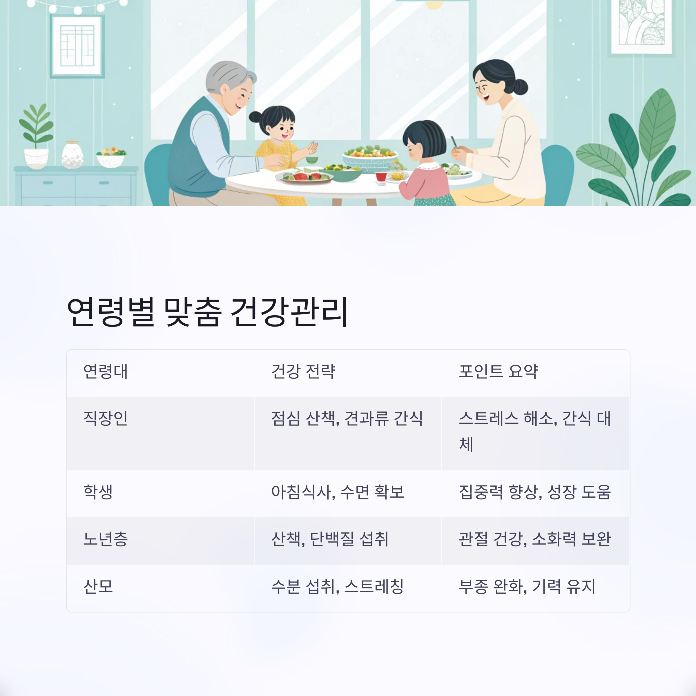 | 직장인 | 점심 산책, 견과류 간식 | 스트레스 해소, 간식 대체 |