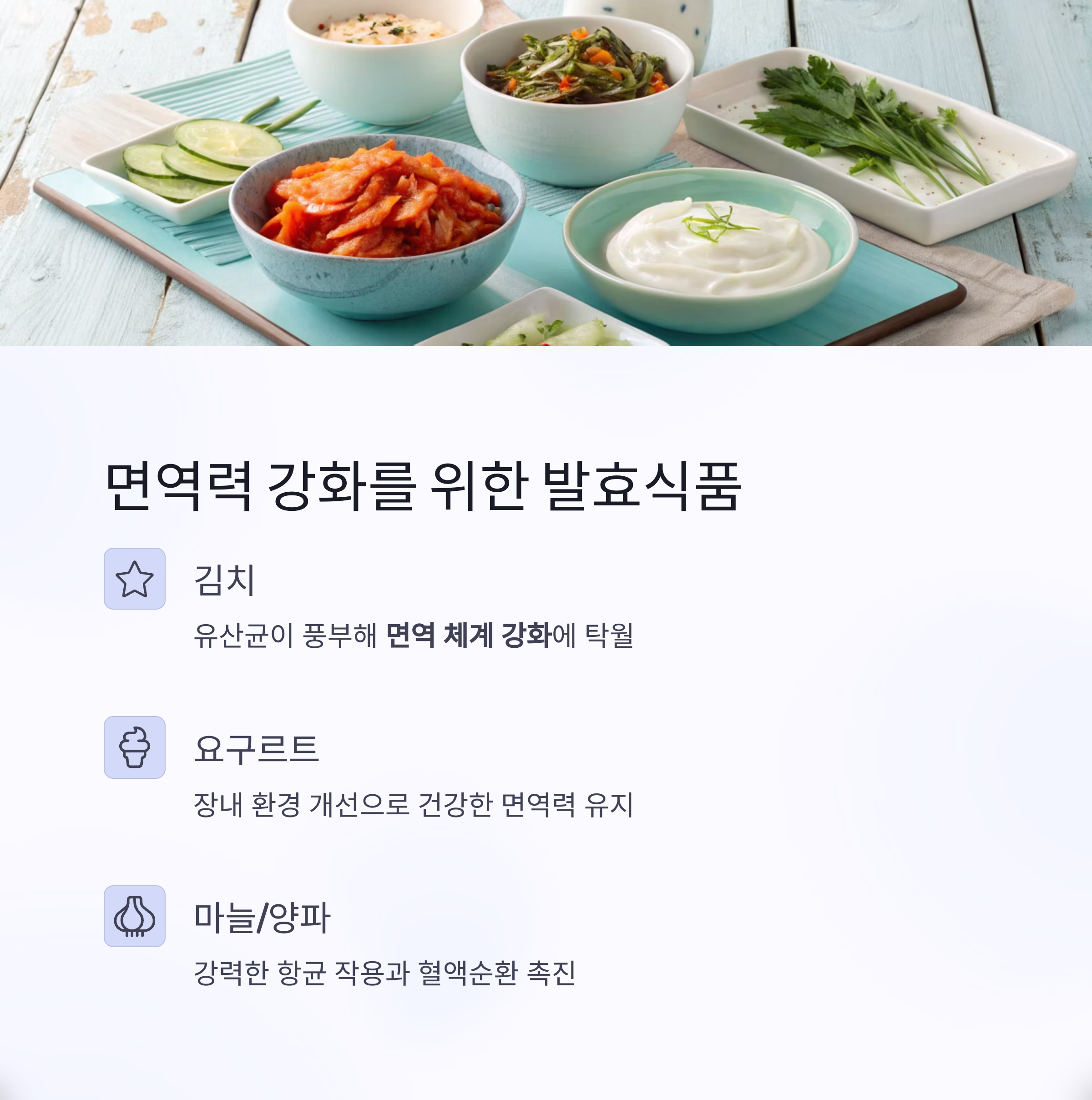 발효식품은 유산균이 장내 환경을 개선해 면역 체계를 강화하는 데 탁월한 효과가 있습니다.