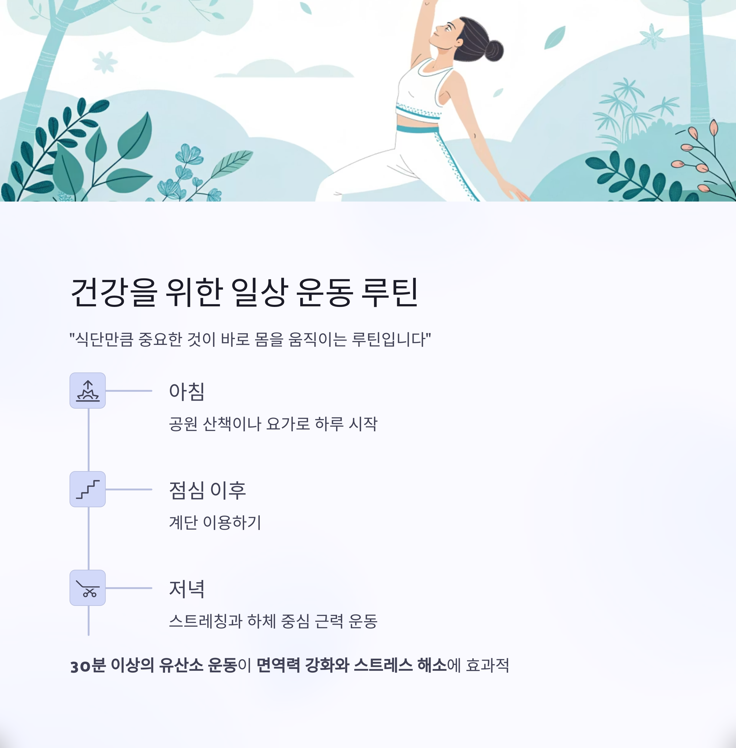 특히 30분 이상의 유산소 운동을 매일 꾸준히 하는 것이 면역력 강화와 스트레스 해소에 매우 효과적입니다.