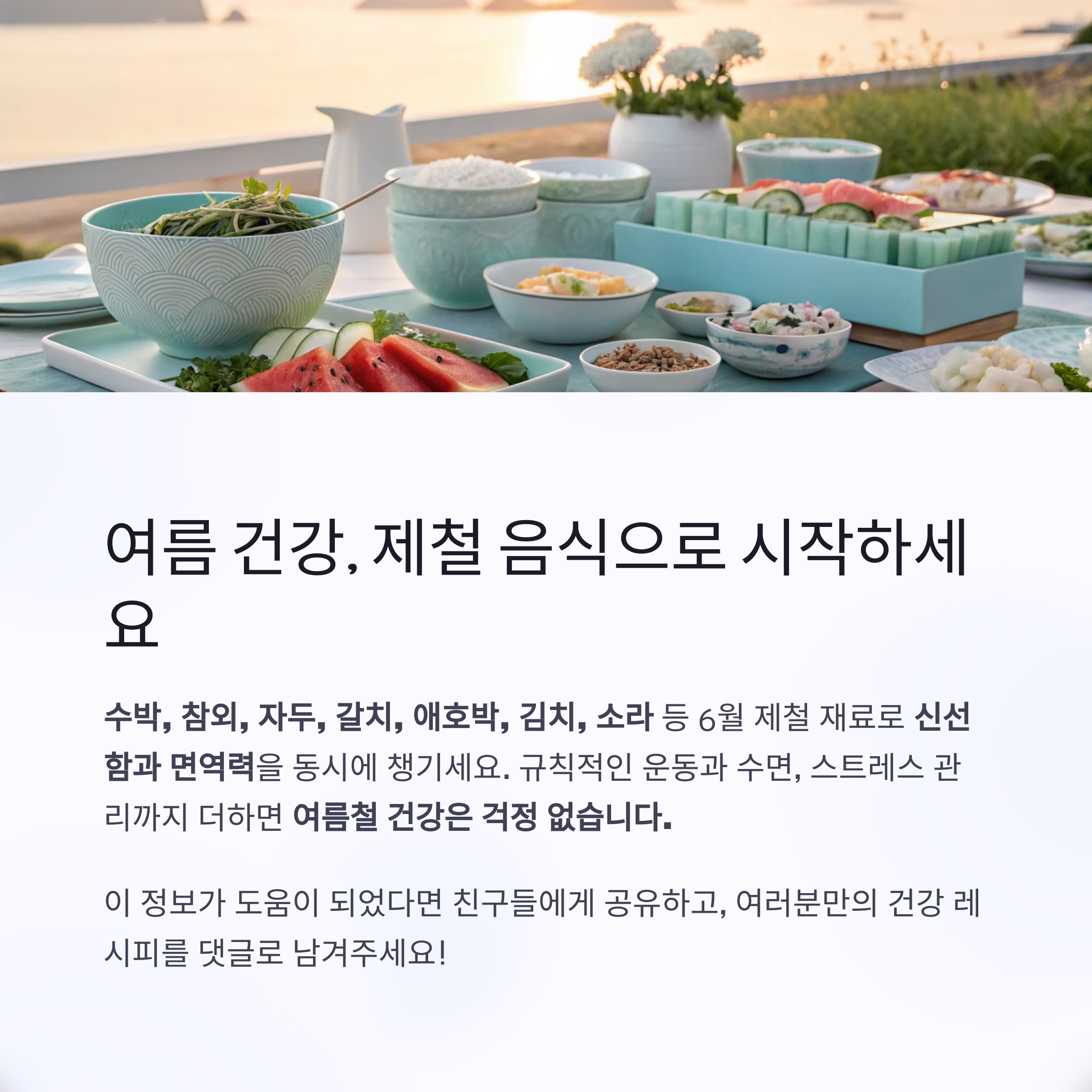 제철 재료로 만든 건강 식단은 여름철 면역력 저하를 예방하고 활력을 유지하는 데 핵심적인 역할을 합니다