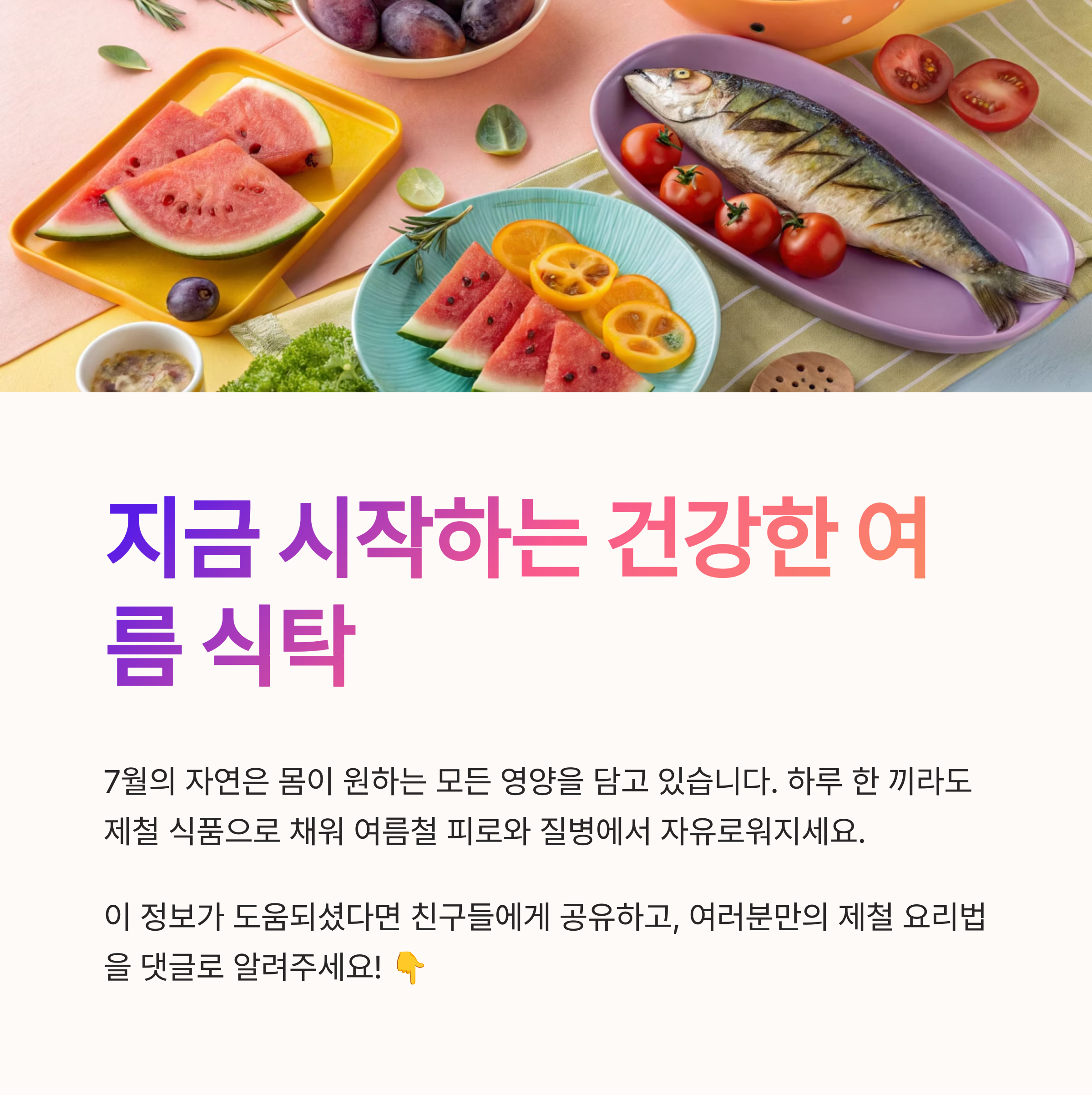 7월은 높은 기온과 습도로 인해 체력 저하와 면역력 약화가 쉽게 일어나는 시기입니다. 이럴 때일수록 계절의 흐름에 따라 자연이 선사하는 제철 식재료를 섭취하는 것이 건강 유지에 핵심적인 방법입니다. 수박, 자두, 도라지, 토마토 등은 수분 보충과 항산화 작용, 면역력 향상에 뛰어난 효능을 지니고 있어 무더위 속에서 우리 몸을 지키는 데 효과적입니다. 지금부터 7월 제철 음식의 과학적 효능과 활용법을 하나씩 살펴보겠습니다.
