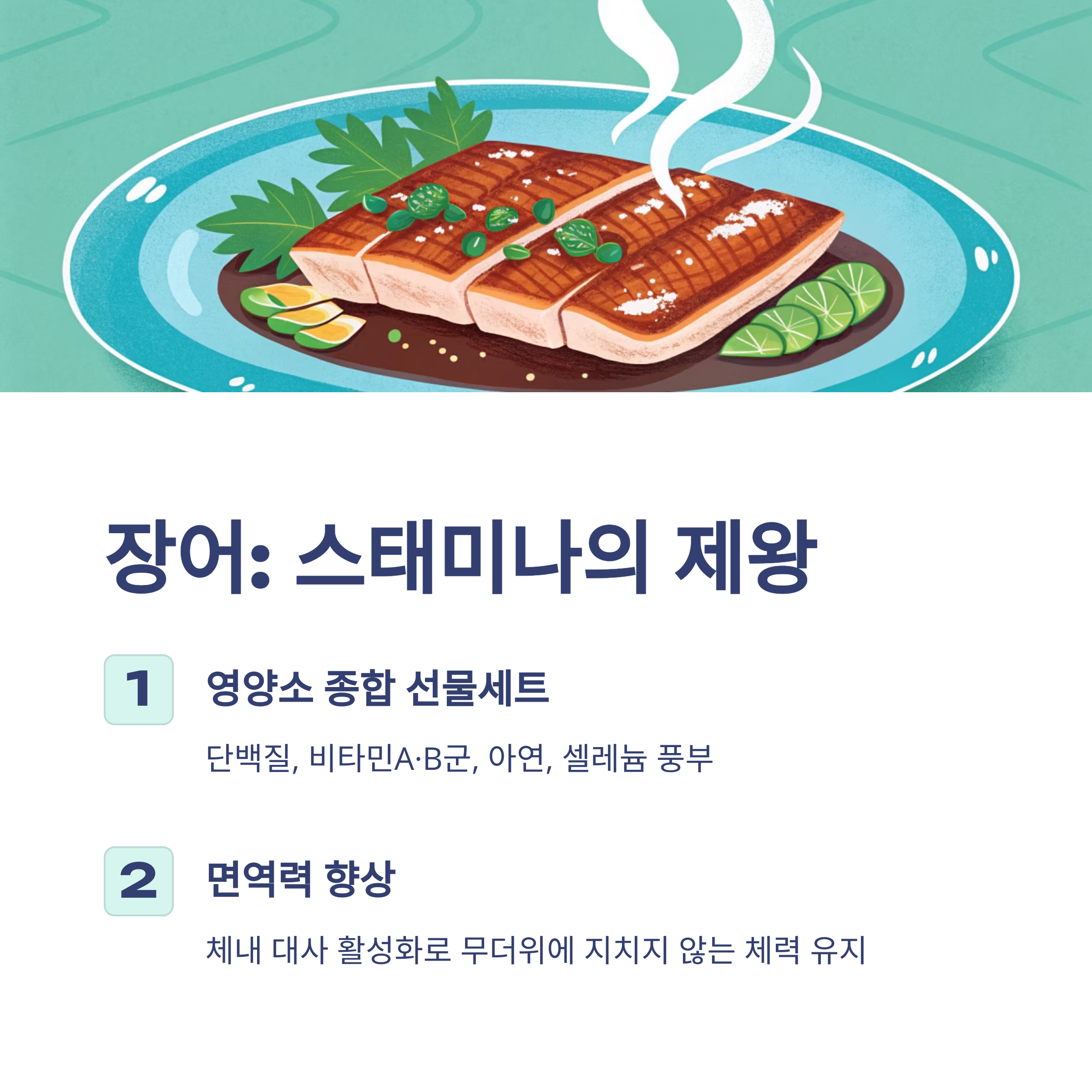 | 장어 | 단백질, 비타민A·B | 스태미나 증진, 간 기능 강화 |