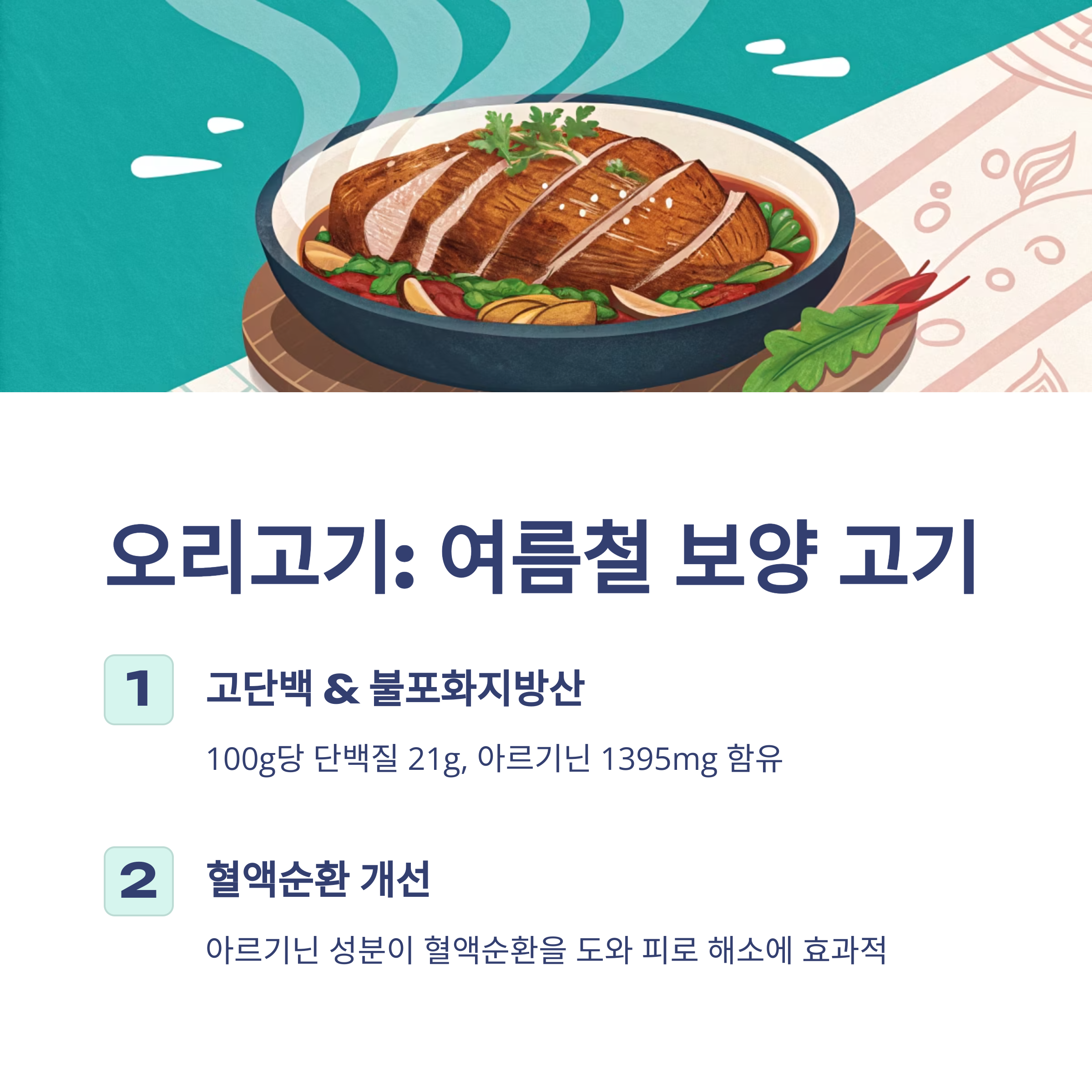 | 오리고기 | 단백질, 아르기닌 | 근력 강화, 피로 해소 |