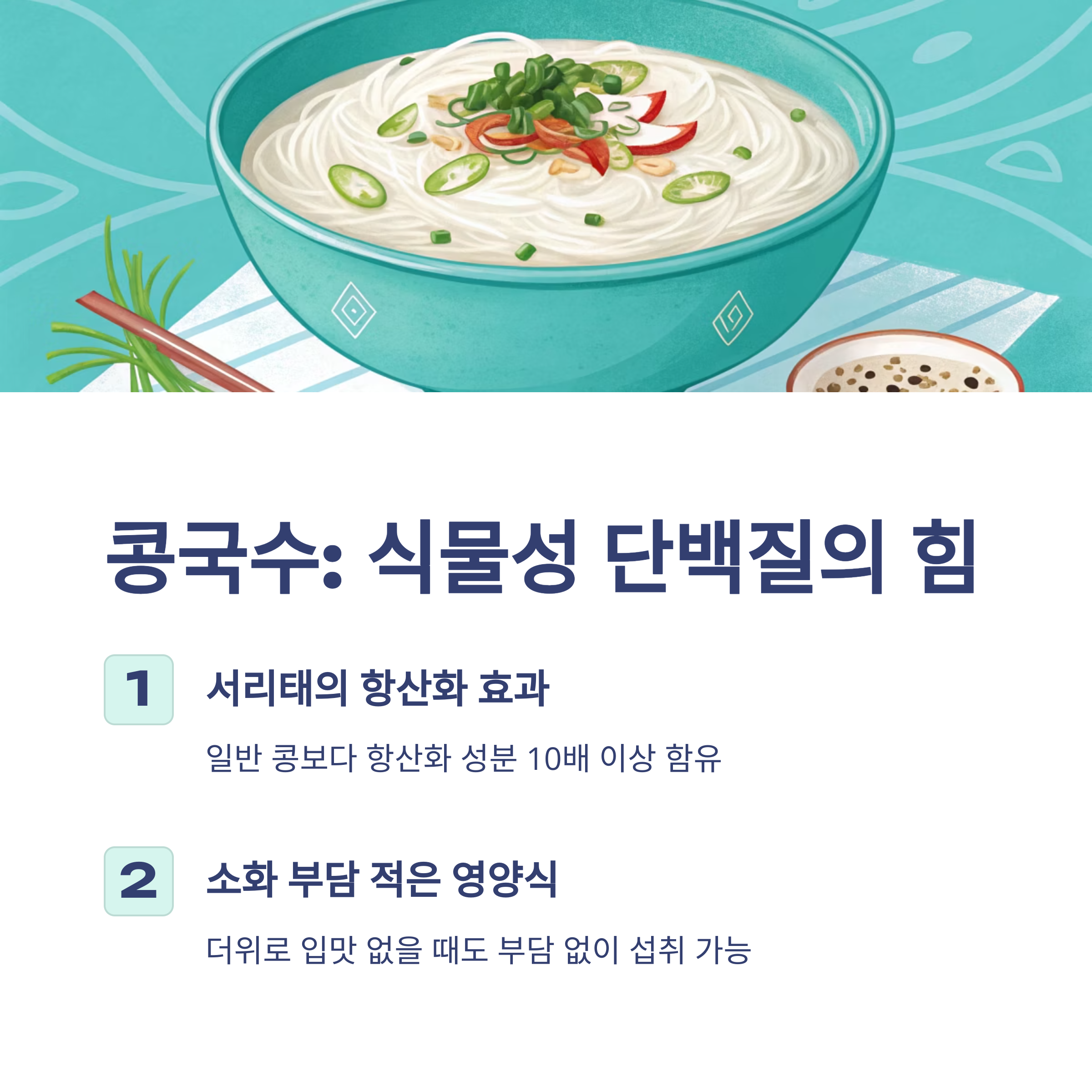 | 콩국수 | 식물성 단백질, 항산화 | 활력 보충, 면역력 강화 |