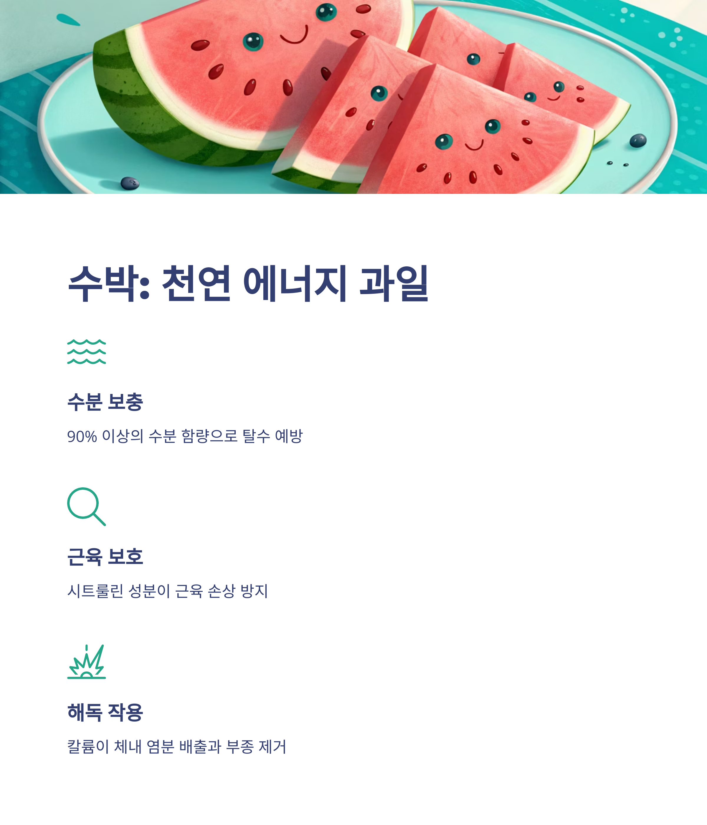 | 수박 | 수분, 칼륨, 시트룰린 | 탈수 예방, 해독, 에너지 보충 |