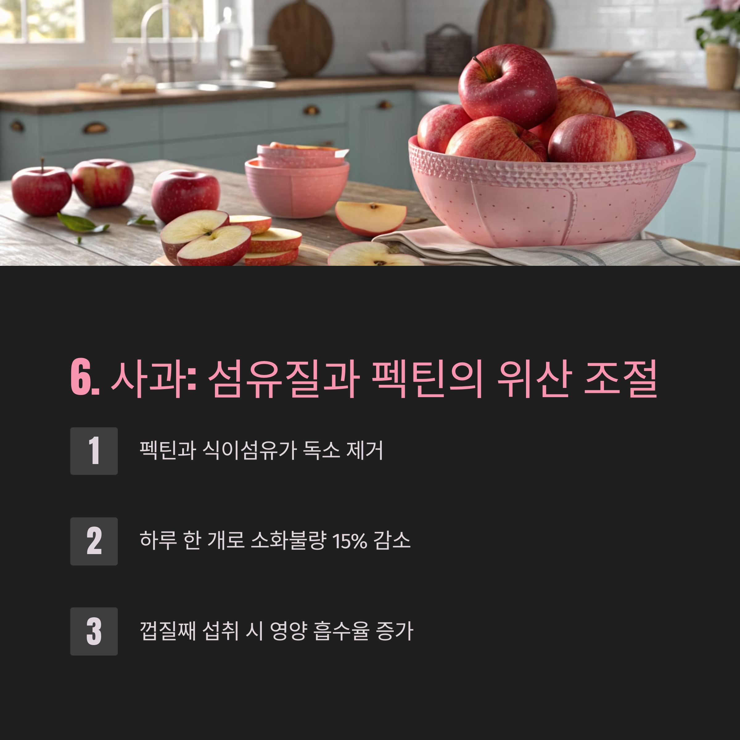 사과: 섬유질과 펙틴으로 소화 개선과 위산 조절