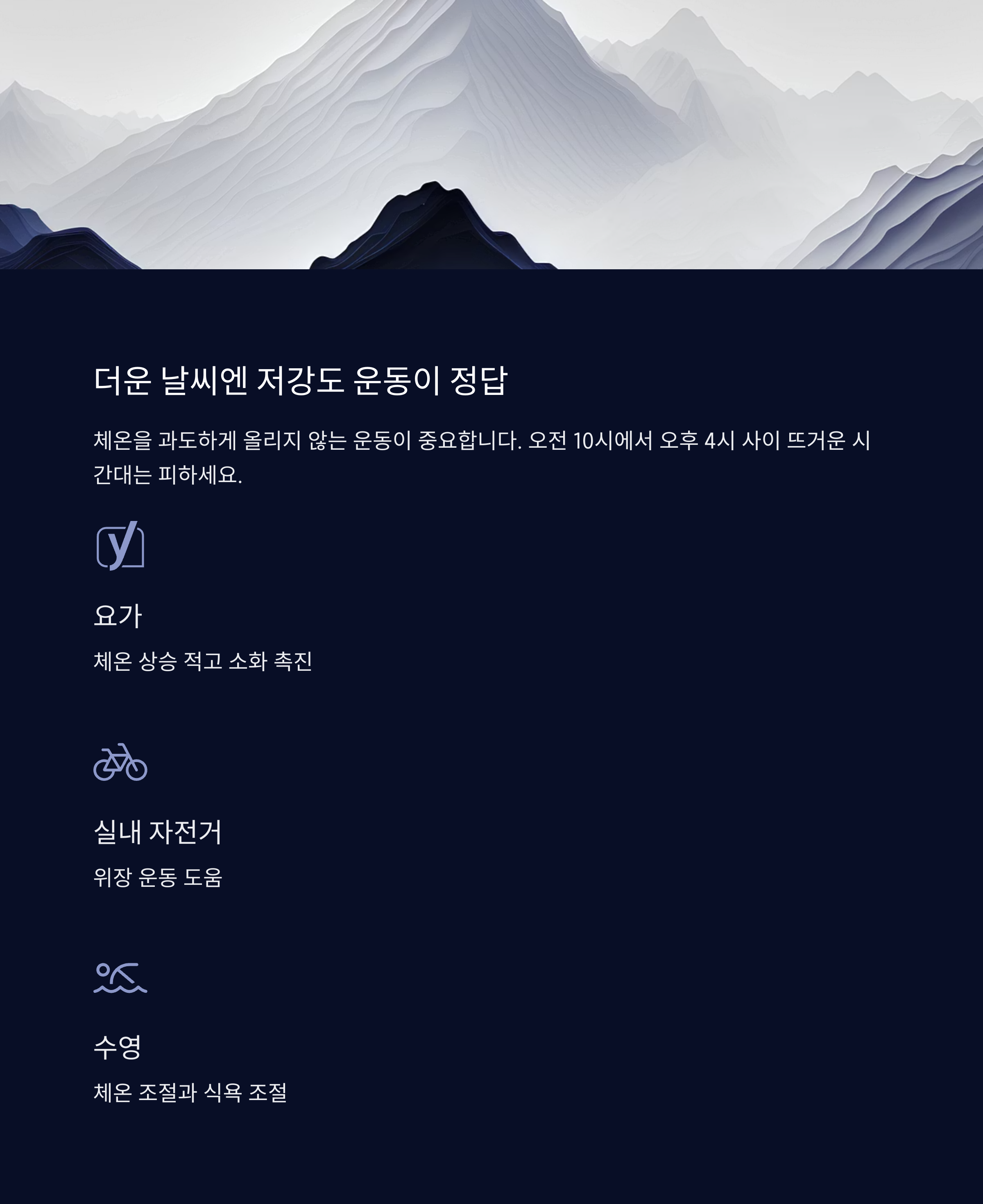 중요합니다. 요가, 실내 자전거, 수영처럼 체온 상승이 적은